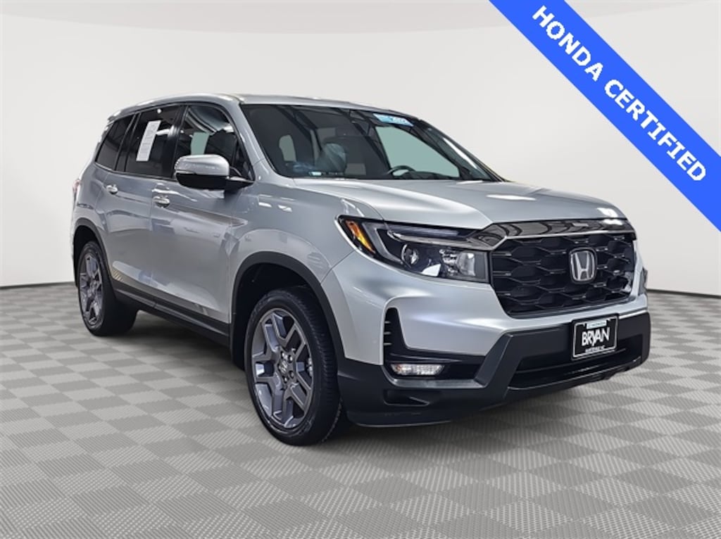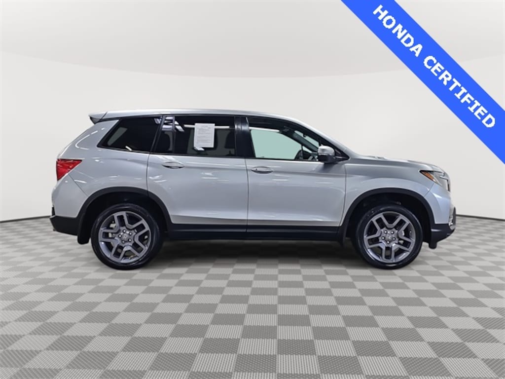 This 2022 Honda Passport EX-L in Lunar Silver Metallic features: HondaTrue Certified Certified, HondaTrue Certified Certified, 4-Wheel Disc Brakes, 4.334 Axle Ratio, 7 Speakers, A/V remote: CabinControl, ABS brakes, Air Conditioning, Alloy wheels, AM/FM radio: SiriusXM, Apple CarPlay/Android Auto, Auto High-beam Headlights, Auto-dimming Rear-View mirror, Automatic temperature control, Blind Spot Information (BSI) System warning, Brake assist, Bumpers: body-color, Delay-off headlights, Driver door bin, Driver vanity mirror, Driver's Seat Mounted Armrest, Dual front impact airbags, Dual front side impact airbags, Electronic Stability Control, Emergency communication system: HondaLink Assist, Exterior Parking Camera Rear, Forward collision: Collision Mitigation Braking System (CMBS) + FCW mitigation, Four wheel independent suspension, Front anti-roll bar, Front Bucket Seats, Front Center Armrest, Front dual zone A/C, Front reading lights, Fully automatic headlights, Garage door transmitter: HomeLink, Heated door mirrors, Heated Front Bucket Seats, Heated front seats, Illuminated entry, Lane departure: Lane Keeping Assist System (LKAS) active, Leather-Trimmed Seats, Low tire pressure warning, Memory seat, Occupant sensing airbag, Outside temperature display, Overhead airbag, Overhead console, Panic alarm, Passenger door bin, Passenger seat mounted armrest, Passenger vanity mirror, Power door mirrors, Power driver seat, Power Liftgate, Power moonroof, Power passenger seat, Power steering, Power windows, Radio data system, Radio: 215-Watt Audio System w/7 Speakers, Rear air conditioning, Rear anti-roll bar, Rear reading lights, Rear seat center armrest, Rear window defroster, Rear window wiper, Remote keyless entry, Security system, Speed control, Speed-sensing steering, Split folding rear seat, Spoiler, Steering wheel mounted audio controls, Tachometer, Telescoping steering wheel, Tilt steering wheel, Traction control, Trip computer, Turn signal indicator mirrors, Variably intermittent wipers, Wheels: 20" Pewter Gray Alloy.