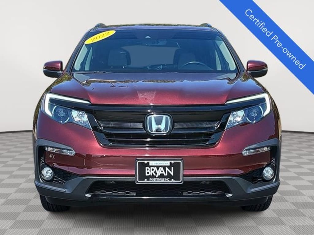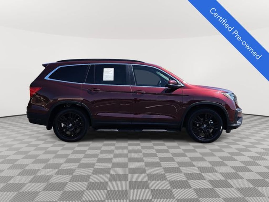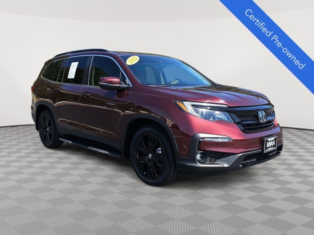 This 2022 Honda Pilot Special Edition in Deep Scarlet Pearl features: HondaTrue Certified Certified, HondaTrue Certified Certified, 3rd row seats: split-bench, 4-Wheel Disc Brakes, 4.33 Axle Ratio, 7 Speakers, A/V remote: CabinControl, ABS brakes, Air Conditioning, Alloy wheels, AM/FM radio: SiriusXM, Apple CarPlay/Android Auto, Auto High-beam Headlights, Auto-dimming Rear-View mirror, Automatic temperature control, Blind Spot Information (BSI) System warning, Brake assist, Bumpers: body-color, Delay-off headlights, Driver door bin, Driver vanity mirror, Dual front impact airbags, Dual front side impact airbags, Electronic Stability Control, Emergency communication system: HondaLink Assist, Exterior Parking Camera Rear, Forward collision: Collision Mitigation Braking System (CMBS) + FCW mitigation, Four wheel independent suspension, Front anti-roll bar, Front Bucket Seats, Front Center Armrest, Front dual zone A/C, Front fog lights, Front reading lights, Fully automatic headlights, Garage door transmitter: HomeLink, Heated door mirrors, Heated Front Bucket Seats, Heated front seats, Illuminated entry, Lane departure: Lane Keeping Assist System (LKAS) active, Leather Seat Trim, Low tire pressure warning, Memory seat, Occupant sensing airbag, Outside temperature display, Overhead airbag, Overhead console, Panic alarm, Passenger door bin, Passenger vanity mirror, Power door mirrors, Power driver seat, Power Liftgate, Power moonroof, Power passenger seat, Power steering, Power windows, Radio data system, Radio: 215-Watt Audio System, Rear air conditioning, Rear anti-roll bar, Rear reading lights, Rear seat center armrest, Rear window defroster, Rear window wiper, Reclining 3rd row seat, Remote keyless entry, Roof rack: rails only, Security system, Speed control, Speed-sensing steering, Speed-Sensitive Wipers, Split folding rear seat, Spoiler, Steering wheel mounted audio controls, Tachometer, Telescoping steering wheel, Tilt steering wheel, Traction control, Trip computer, Turn signal indicator mirrors, Variably intermittent wipers, Wheels: 20" Exclusive Gloss Black Alloy, LOCAL ONE OWNER.
