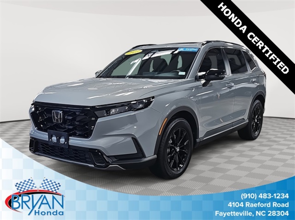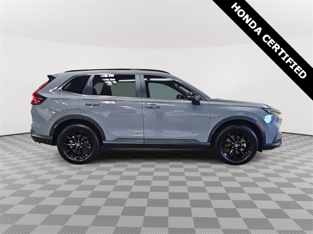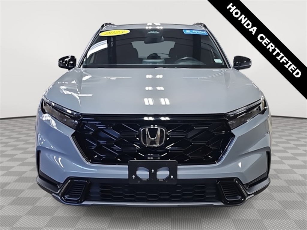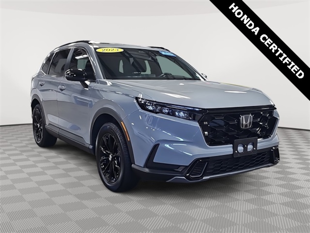 This 2023 Honda CR-V Hybrid Sport in Meteorite Gray Metallic features: HondaTrue Certified Certified, 2.0L I4 DOHC 16V, HondaTrue Certified Certified, 2.0L I4 DOHC 16V, 4-Wheel Disc Brakes, 4.438 Axle Ratio, 6 Speakers, ABS brakes, Adaptive Cruise Control: Adaptive Cruise Control (ACC) with Low-Speed Follow, Air Conditioning, Alloy wheels, Apple CarPlay/Android Auto, Auto High-beam Headlights, Automatic temperature control, Brake assist, Bumpers: body-color, Cloth Seat Trim, Compass, Delay-off headlights, Driver door bin, Driver vanity mirror, Dual front impact airbags, Dual front side impact airbags, Electronic Stability Control, Exterior Parking Camera Rear, Four wheel independent suspension, Front anti-roll bar, Front Bucket Seats, Front Center Armrest, Front dual zone A/C, Front reading lights, Fully automatic headlights, Heated door mirrors, Heated Front Bucket Seats, Heated front seats, Illuminated entry, Knee airbag, Leather Shift Knob, Leather steering wheel, Low tire pressure warning, Occupant sensing airbag, Outside temperature display, Overhead airbag, Overhead console, Panic alarm, Passenger door bin, Passenger vanity mirror, Power door mirrors, Power driver seat, Power moonroof, Power steering, Power windows, Radio data system, Radio: 240-Watt AM/FM Audio System, Rear anti-roll bar, Rear reading lights, Rear seat center armrest, Rear side impact airbag, Rear window defroster, Rear window wiper, Remote keyless entry, Security system, Speed control, Speed-sensing steering, Speed-Sensitive Wipers, Split folding rear seat, Spoiler, Steering wheel mounted audio controls, Telescoping steering wheel, Tilt steering wheel, Traction control, Trip computer, Turn signal indicator mirrors, Variably intermittent wipers, Wheels: 18" Berlina Black Alloy, ONE OWNER UNIT.
