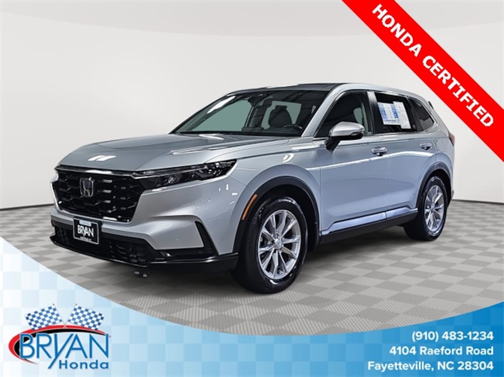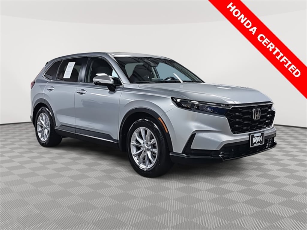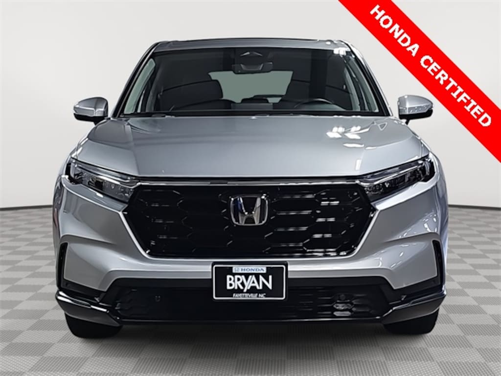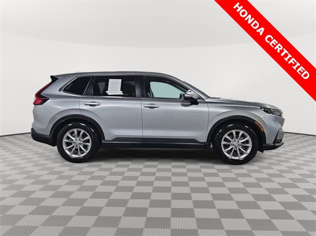 This 2023 Honda CR-V EX-L in Lunar Silver Metallic features: HondaTrue Certified Certified, HondaTrue Certified Certified, 4-Wheel Disc Brakes, 5.64 Axle Ratio, 8 Speakers, ABS brakes, Adaptive Cruise Control: Adaptive Cruise Control (ACC) with Low-Speed Follow, Air Conditioning, Alloy wheels, AM/FM radio: SiriusXM, Auto High-beam Headlights, Auto-dimming Rear-View mirror, Automatic temperature control, Brake assist, Bumpers: body-color, Compass, Delay-off headlights, Driver door bin, Driver vanity mirror, Dual front impact airbags, Dual front side impact airbags, Electronic Stability Control, Exterior Parking Camera Rear, Four wheel independent suspension, Front anti-roll bar, Front Bucket Seats, Front Center Armrest, Front dual zone A/C, Front reading lights, Fully automatic headlights, Heated door mirrors, Heated Front Bucket Seats, Heated front seats, Illuminated entry, Knee airbag, Leather Seat Trim, Leather Shift Knob, Leather steering wheel, Low tire pressure warning, Memory seat, Occupant sensing airbag, Outside temperature display, Overhead airbag, Overhead console, Panic alarm, Passenger door bin, Passenger vanity mirror, Power door mirrors, Power driver seat, Power Liftgate, Power moonroof, Power passenger seat, Power steering, Power windows, Radio data system, Radio: 320-Watt AM/FM/HD/SiriusXM Audio System, Rear anti-roll bar, Rear reading lights, Rear seat center armrest, Rear side impact airbag, Rear window defroster, Rear window wiper, Remote keyless entry, Security system, Speed control, Speed-sensing steering, Speed-Sensitive Wipers, Split folding rear seat, Spoiler, Steering wheel mounted audio controls, Tachometer, Telescoping steering wheel, Tilt steering wheel, Traction control, Trip computer, Turn signal indicator mirrors, Variably intermittent wipers, Wheels: 18" Sparkle Silver Metallic, Wireless Apple CarPlay/Wireless Android Auto, LOCAL ONE OWNER.