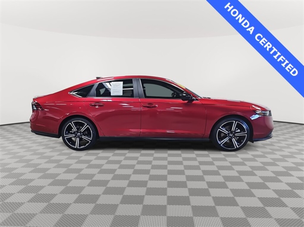 This 2024 Honda Accord Hybrid Sport in Radiant Red Metallic features: HondaTrue Certified Certified, 2.0L 16V DOHC, HondaTrue Certified Certified, 2.0L 16V DOHC, 4-Wheel Disc Brakes, 8 Speakers, ABS brakes, Adaptive Cruise Control: Adaptive Cruise Control (ACC) with Low-Speed Follow, Air Conditioning, Alloy wheels, AM/FM radio, Apple CarPlay/Android Auto, Auto High-beam Headlights, Automatic temperature control, Blind Spot Information (BSI) System warning, Brake assist, Bumpers: body-color, Compass, Delay-off headlights, Driver door bin, Driver vanity mirror, Dual front impact airbags, Dual front side impact airbags, Electronic Stability Control, Emergency communication system: HondaLink, Exterior Parking Camera Rear, Fabric Seat Trim, Four wheel independent suspension, Front anti-roll bar, Front Bucket Seats, Front Center Armrest, Front dual zone A/C, Front reading lights, Fully automatic headlights, Illuminated entry, Knee airbag, Lane departure: Lane Keeping Assist System (LKAS) active, Leather Shift Knob, Leather steering wheel, Low tire pressure warning, Occupant sensing airbag, Outside temperature display, Overhead airbag, Overhead console, Panic alarm, Passenger door bin, Passenger vanity mirror, Power door mirrors, Power driver seat, Power moonroof, Power steering, Power windows, Radio data system, Radio: 180-Watt Audio System, Rear anti-roll bar, Rear reading lights, Rear seat center armrest, Rear side impact airbag, Rear window defroster, Remote keyless entry, Security system, Speed control, Speed-sensing steering, Speed-Sensitive Wipers, Split folding rear seat, Spoiler, Steering wheel mounted audio controls, Telescoping steering wheel, Tilt steering wheel, Traction control, Trip computer, Variably intermittent wipers, Wheels: 19" x 8.5J Berlina Black.