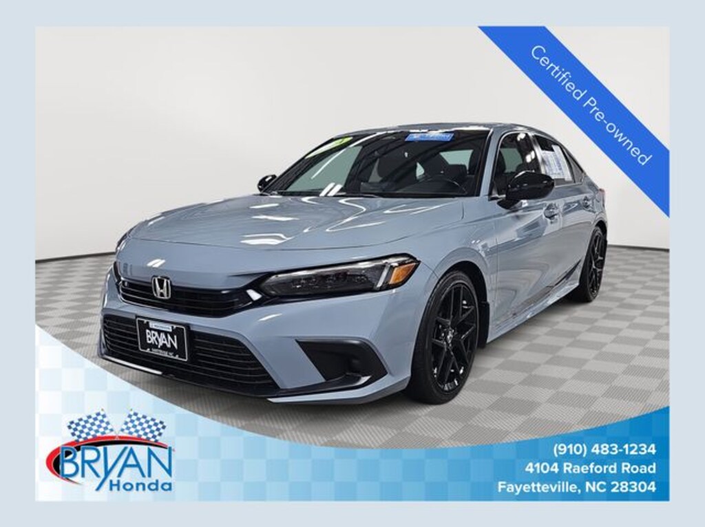 This 2024 Honda Civic Sport in Sonic Gray Pearl features: HondaTrue Certified Certified, Black w/Cloth Seating Surfaces, HondaTrue Certified Certified, Black w/Cloth Seating Surfaces, 4-Wheel Disc Brakes, 8 Speakers, ABS brakes, Adaptive Cruise Control: Adaptive Cruise Control (ACC) with Low-Speed Follow, Air Conditioning, Alloy wheels, AM/FM radio, Apple CarPlay/Android Auto, Auto High-beam Headlights, Automatic temperature control, Brake assist, Bumpers: body-color, Cloth/Leatherette Seating Surfaces, Delay-off headlights, Driver door bin, Driver vanity mirror, Dual front impact airbags, Dual front side impact airbags, Electronic Stability Control, Emergency communication system: HondaLink, Exterior Parking Camera Rear, Four wheel independent suspension, Front anti-roll bar, Front Bucket Seats, Front Center Armrest, Front reading lights, Fully automatic headlights, Illuminated entry, Knee airbag, Leather Shift Knob, Leather steering wheel, Low tire pressure warning, Occupant sensing airbag, Outside temperature display, Overhead airbag, Panic alarm, Passenger door bin, Passenger vanity mirror, Power door mirrors, Power steering, Power windows, Radio data system, Radio: 180-Watt Audio System, Rear anti-roll bar, Rear side impact airbag, Rear window defroster, Remote keyless entry, Security system, Speed control, Speed-sensing steering, Steering wheel mounted audio controls, Tachometer, Telescoping steering wheel, Tilt steering wheel, Traction control, Trip computer, Wheels: 18" Gloss Black Alloy, LOCAL ONE OWNER.