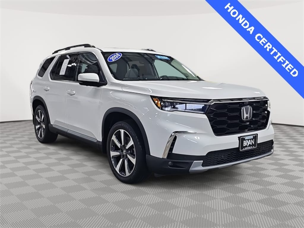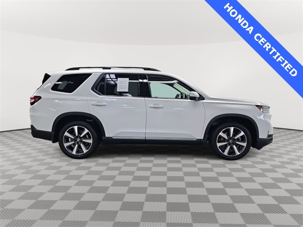 This 2024 Honda Pilot Elite in Platinum White Pearl features: HondaTrue Certified Certified, AWD, HondaTrue Certified Certified, AWD, 12 Speakers, 3rd row seats: split-bench, 4-Wheel Disc Brakes, ABS brakes, Adaptive Cruise Control: Adaptive Cruise Control (ACC) with Low-Speed Follow, Air Conditioning, Alloy wheels, AM/FM radio: SiriusXM, Apple CarPlay/Android Auto, Auto High-beam Headlights, Auto-dimming door mirrors, Auto-dimming Rear-View mirror, Automatic temperature control, Axle Ratio: 4.167, Blind Spot Information (BSI) System warning, Brake assist, Bumpers: body-color, Compass, Delay-off headlights, Driver door bin, Driver vanity mirror, Dual front impact airbags, Dual front side impact airbags, Electronic Stability Control, Emergency communication system: HondaLink, Exterior Parking Camera Rear, Four wheel independent suspension, Front anti-roll bar, Front Bucket Seats, Front Center Armrest, Front dual zone A/C, Front fog lights, Front reading lights, Fully automatic headlights, Garage door transmitter: HomeLink, Heads-Up Display, Heated & Ventilated Front Bucket Seats, Heated door mirrors, Heated front seats, Heated rear seats, Heated steering wheel, Illuminated entry, Knee airbag, Lane departure: Lane Keeping Assist System (LKAS) active, Low tire pressure warning, Memory seat, Navigation system: Honda Satellite-Linked Navigation System, Occupant sensing airbag, Outside temperature display, Overhead airbag, Overhead console, Panic alarm, Passenger door bin, Passenger vanity mirror, Perforated Leather Seat Trim, Power door mirrors, Power driver seat, Power Liftgate, Power moonroof, Power passenger seat, Power steering, Power windows, Radio data system, Radio: BOSE Premium Sound System, Rain sensing wipers, Rear air conditioning, Rear anti-roll bar, Rear reading lights, Rear seat center armrest, Rear window defroster, Rear window wiper, Reclining 3rd row seat, Remote keyless entry, Security system, Speed control, Speed-sensing steering, Speed-Sensitive Wipers, Split folding rear seat, Spoiler, Steering wheel mounted audio controls, Tachometer, Telescoping steering wheel, Tilt steering wheel, Traction control, Trip computer, Turn signal indicator mirrors, Variably intermittent wipers, Ventilated front seats, Wheels: 20" Shark Gray Machine Face w/Blk Lug Nuts, LOCAL ONE OWNER.