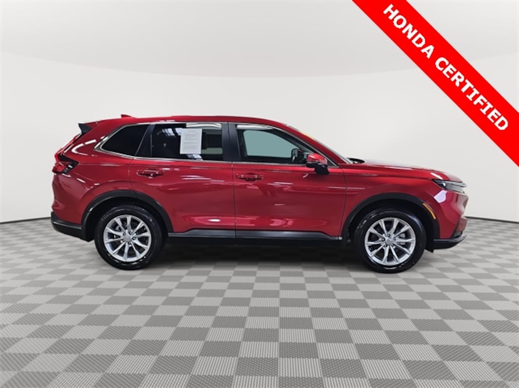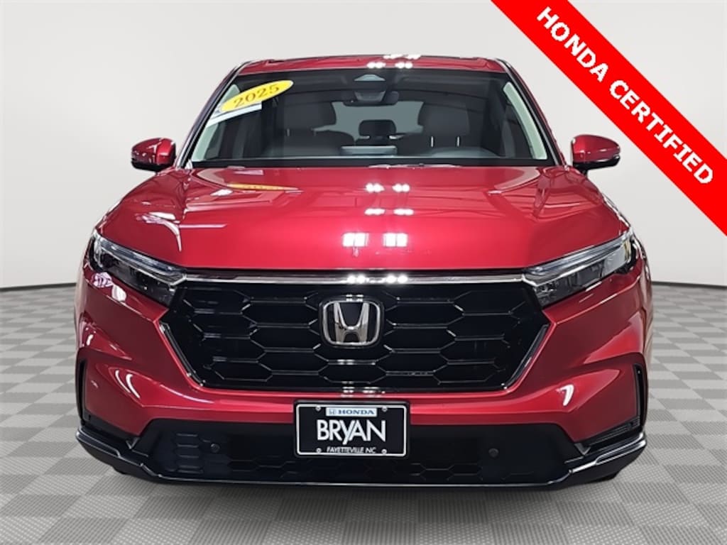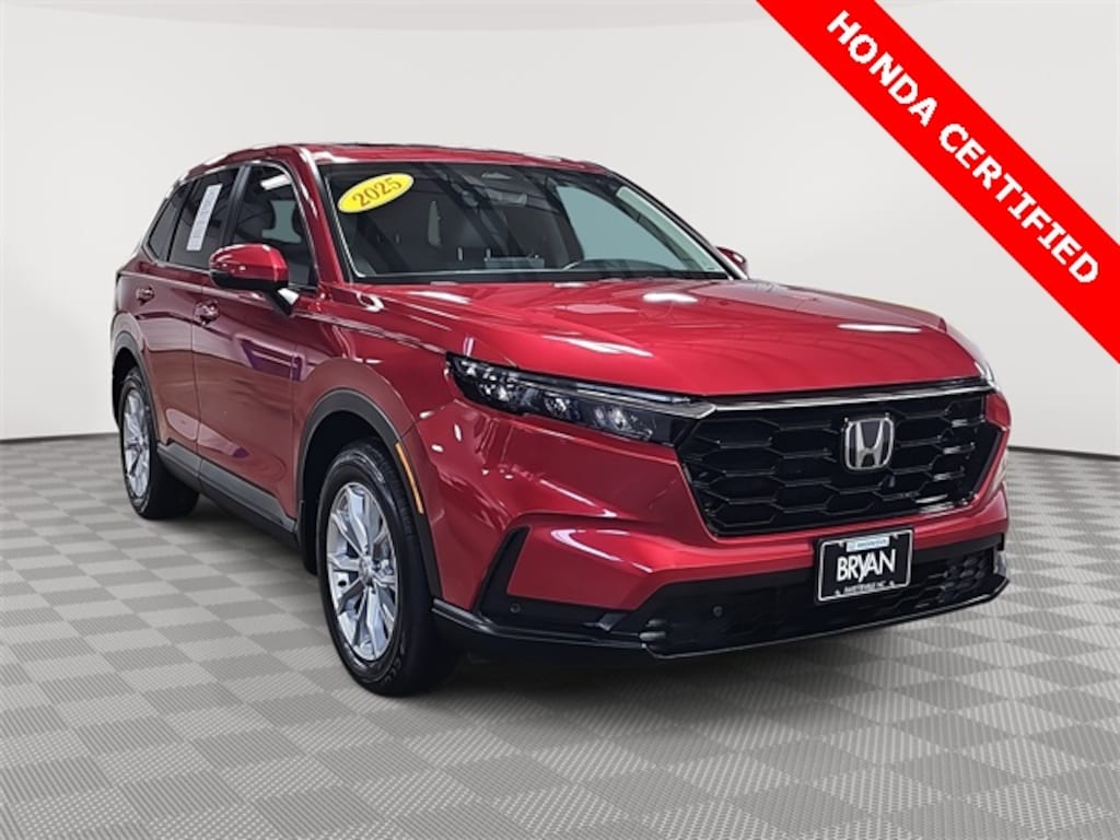 This 2025 Honda CR-V EX-L in Radiant Red Metallic features: HondaTrue Certified Certified, AWD, HondaTrue Certified Certified, AWD, 4-Wheel Disc Brakes, 8 Speakers, ABS brakes, Adaptive Cruise Control: Adaptive Cruise Control (ACC) with Low-Speed Follow, Air Conditioning, Alloy wheels, AM/FM radio: SiriusXM, Auto High-beam Headlights, Auto-dimming Rear-View mirror, Automatic temperature control, Blind Spot Information (BSI) System warning, Brake assist, Bumpers: body-color, Compass, Delay-off headlights, Driver door bin, Driver vanity mirror, Dual front impact airbags, Dual front side impact airbags, Electronic Stability Control, Exterior Parking Camera Rear, Four wheel independent suspension, Front anti-roll bar, Front Bucket Seats, Front Center Armrest, Front dual zone A/C, Front reading lights, Fully automatic headlights, Heated door mirrors, Heated Front Bucket Seats, Heated front seats, Illuminated entry, Knee airbag, Leather Seat Trim, Leather Shift Knob, Leather steering wheel, Low tire pressure warning, Memory seat, Occupant sensing airbag, Outside temperature display, Overhead airbag, Overhead console, Panic alarm, Passenger door bin, Passenger vanity mirror, Power door mirrors, Power driver seat, Power Liftgate, Power moonroof, Power passenger seat, Power steering, Power windows, Radio data system, Radio: 320-Watt AM/FM/HD/SiriusXM Audio System, Rear anti-roll bar, Rear reading lights, Rear seat center armrest, Rear side impact airbag, Rear window defroster, Rear window wiper, Remote keyless entry, Security system, Speed control, Speed-sensing steering, Speed-Sensitive Wipers, Split folding rear seat, Spoiler, Steering wheel mounted audio controls, Tachometer, Telescoping steering wheel, Tilt steering wheel, Traction control, Trip computer, Turn signal indicator mirrors, Variably intermittent wipers, Wheels: 18" Sparkle Silver Metallic, LOCAL ONE OWNER.