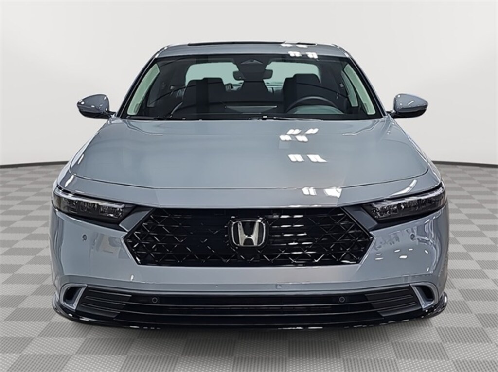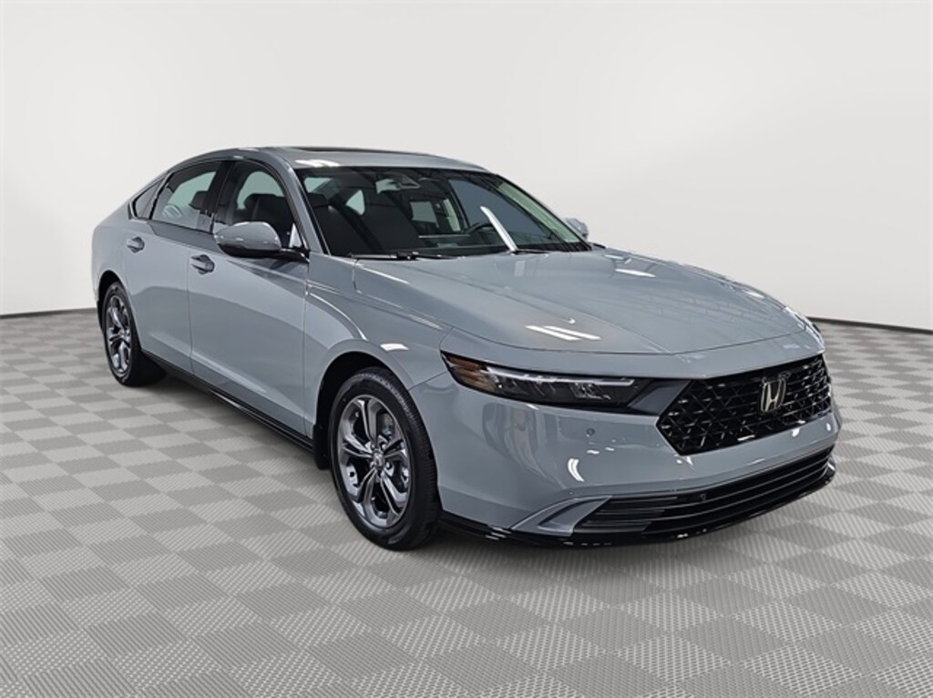 This 2025 Honda Accord Hybrid EX-L in Urban Gray Pearl features: 2.0L I4 DOHC 16V, 2.0L I4 DOHC 16V, 4-Wheel Disc Brakes, 8 Speakers, ABS brakes, Adaptive Cruise Control: Adaptive Cruise Control (ACC) with Low-Speed Follow, Air Conditioning, Alloy wheels, AM/FM radio, Apple CarPlay/Android Auto, Auto High-beam Headlights, Auto-dimming Rear-View mirror, Automatic temperature control, Blind Spot Information (BSI) System warning, Brake assist, Bumpers: body-color, Compass, Delay-off headlights, Driver door bin, Driver vanity mirror, Dual front impact airbags, Dual front side impact airbags, Electronic Stability Control, Emergency communication system: HondaLink, Exterior Parking Camera Rear, Four wheel independent suspension, Front anti-roll bar, Front Bucket Seats, Front Center Armrest, Front dual zone A/C, Front reading lights, Fully automatic headlights, Heated door mirrors, Heated Front Bucket Seats, Heated front seats, Illuminated entry, Knee airbag, Lane departure: Lane Keeping Assist System (LKAS) active, Leather Shift Knob, Leather steering wheel, Leather-Trimmed Seat Trim, Low tire pressure warning, Memory seat, Occupant sensing airbag, Outside temperature display, Overhead airbag, Overhead console, Panic alarm, Passenger door bin, Passenger vanity mirror, Power door mirrors, Power driver seat, Power moonroof, Power passenger seat, Power steering, Power windows, Radio data system, Radio: 180-Watt Audio System, Rear anti-roll bar, Rear reading lights, Rear seat center armrest, Rear side impact airbag, Rear window defroster, Remote keyless entry, Security system, Speed control, Speed-sensing steering, Speed-Sensitive Wipers, Split folding rear seat, Steering wheel mounted audio controls, Telescoping steering wheel, Tilt steering wheel, Traction control, Trip computer, Turn signal indicator mirrors, Variably intermittent wipers, Wheels: 17" x 7.5J Pewter Gray.