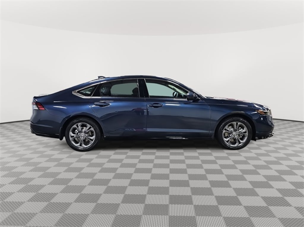 This 2025 Honda Accord Hybrid EX-L in Canyon River Blue Metallic features: 2.0L I4 DOHC 16V, 2.0L I4 DOHC 16V, 4-Wheel Disc Brakes, 8 Speakers, ABS brakes, Adaptive Cruise Control: Adaptive Cruise Control (ACC) with Low-Speed Follow, Air Conditioning, Alloy wheels, AM/FM radio, Apple CarPlay/Android Auto, Auto High-beam Headlights, Auto-dimming Rear-View mirror, Automatic temperature control, Blind Spot Information (BSI) System warning, Brake assist, Bumpers: body-color, Compass, Delay-off headlights, Driver door bin, Driver vanity mirror, Dual front impact airbags, Dual front side impact airbags, Electronic Stability Control, Emergency communication system: HondaLink, Exterior Parking Camera Rear, Four wheel independent suspension, Front anti-roll bar, Front Bucket Seats, Front Center Armrest, Front dual zone A/C, Front reading lights, Fully automatic headlights, Heated door mirrors, Heated Front Bucket Seats, Heated front seats, Illuminated entry, Knee airbag, Lane departure: Lane Keeping Assist System (LKAS) active, Leather Shift Knob, Leather steering wheel, Leather-Trimmed Seat Trim, Low tire pressure warning, Memory seat, Occupant sensing airbag, Outside temperature display, Overhead airbag, Overhead console, Panic alarm, Passenger door bin, Passenger vanity mirror, Power door mirrors, Power driver seat, Power moonroof, Power passenger seat, Power steering, Power windows, Radio data system, Radio: 180-Watt Audio System, Rear anti-roll bar, Rear reading lights, Rear seat center armrest, Rear side impact airbag, Rear window defroster, Remote keyless entry, Security system, Speed control, Speed-sensing steering, Speed-Sensitive Wipers, Split folding rear seat, Steering wheel mounted audio controls, Telescoping steering wheel, Tilt steering wheel, Traction control, Trip computer, Turn signal indicator mirrors, Variably intermittent wipers, Wheels: 17" x 7.5J Pewter Gray.
