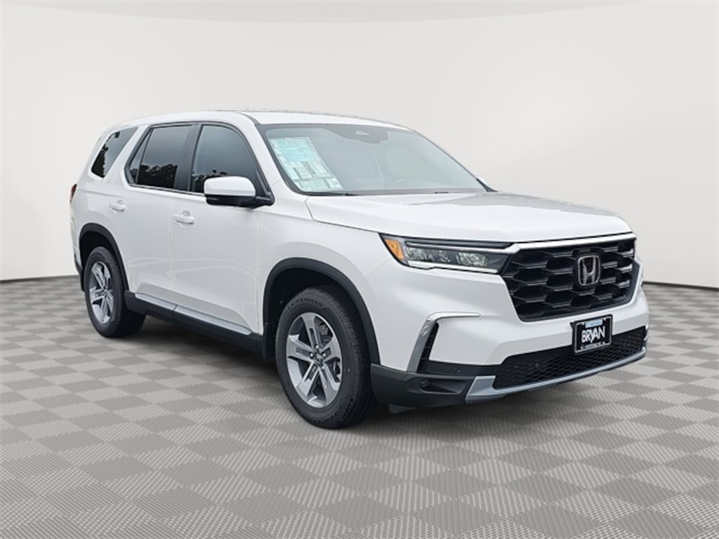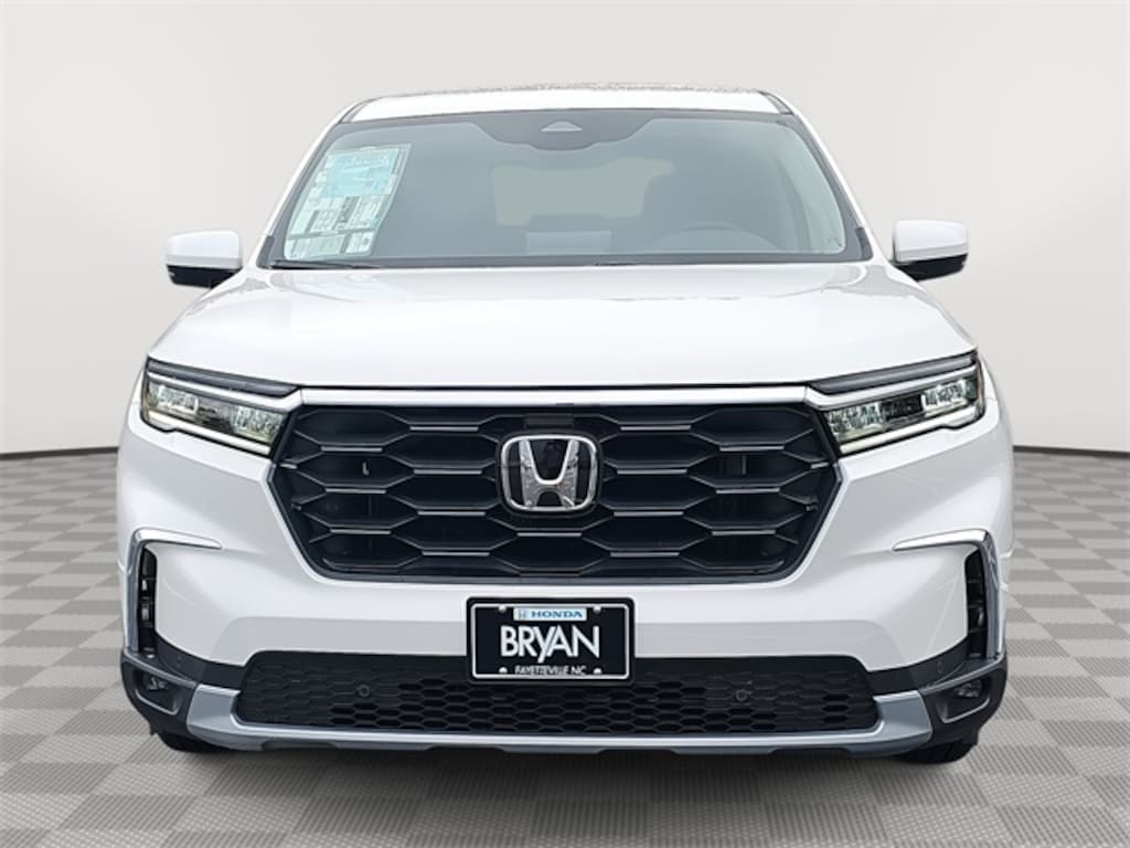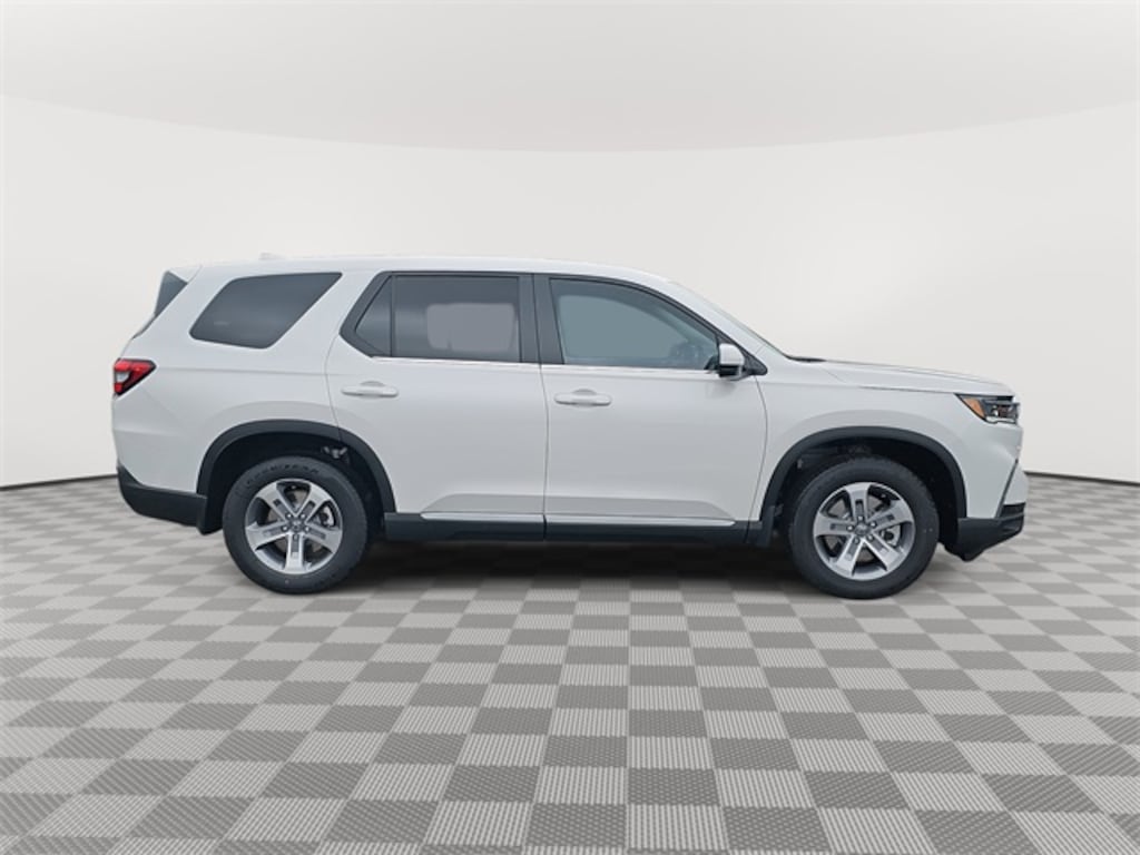 This 2025 Honda Pilot EX-L in Platinum White Pearl features: AWD, AWD, 3rd row seats: split-bench, 4-Wheel Disc Brakes, 4.167 Axle Ratio, 9 Speakers, ABS brakes, Adaptive Cruise Control: Adaptive Cruise Control (ACC) with Low-Speed Follow, Air Conditioning, Alloy wheels, AM/FM radio: SiriusXM, Apple CarPlay/Android Auto, Auto High-beam Headlights, Auto-dimming Rear-View mirror, Automatic temperature control, Blind Spot Information (BSI) System warning, Brake assist, Bumpers: body-color, Delay-off headlights, Driver door bin, Driver vanity mirror, Dual front impact airbags, Dual front side impact airbags, Electronic Stability Control, Emergency communication system: HondaLink Assist, Exterior Parking Camera Rear, Four wheel independent suspension, Front anti-roll bar, Front Bucket Seats, Front Center Armrest, Front dual zone A/C, Front fog lights, Front reading lights, Fully automatic headlights, Garage door transmitter: HomeLink, Heated door mirrors, Heated Front Bucket Seats, Heated front seats, Illuminated entry, Knee airbag, Lane departure: Lane Keeping Assist System (LKAS) active, Leather Seat Trim, Low tire pressure warning, Memory seat, Occupant sensing airbag, Outside temperature display, Overhead airbag, Overhead console, Panic alarm, Passenger door bin, Passenger vanity mirror, Power door mirrors, Power driver seat, Power Liftgate, Power passenger seat, Power steering, Power windows, Radio data system, Radio: 245-Watt Audio System, Rear air conditioning, Rear anti-roll bar, Rear reading lights, Rear seat center armrest, Rear window defroster, Rear window wiper, Reclining 3rd row seat, Remote keyless entry, Security system, SiriusXM, Speed control, Speed-sensing steering, Speed-Sensitive Wipers, Split folding rear seat, Spoiler, Steering wheel mounted audio controls, Tachometer, Telescoping steering wheel, Tilt steering wheel, Traction control, Trip computer, Turn signal indicator mirrors, Variably intermittent wipers, Wheels: 18" Pewter Gray Machined Face.