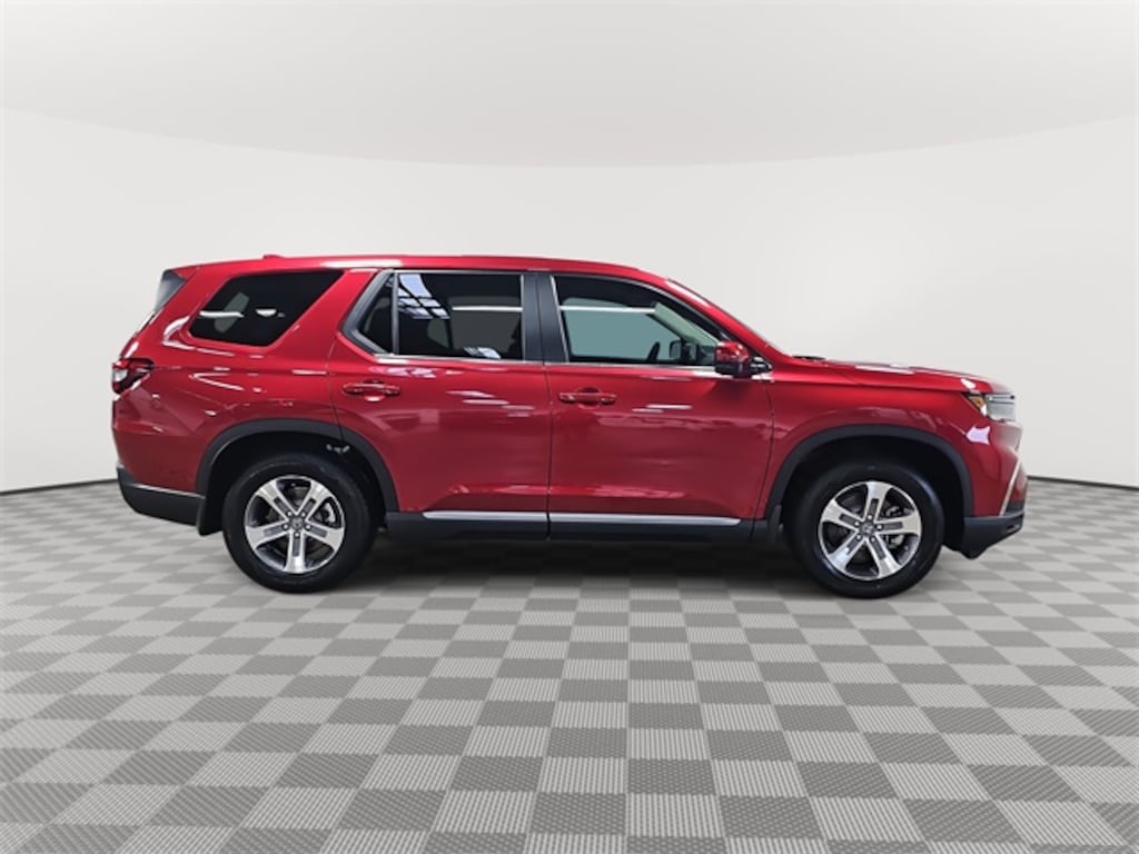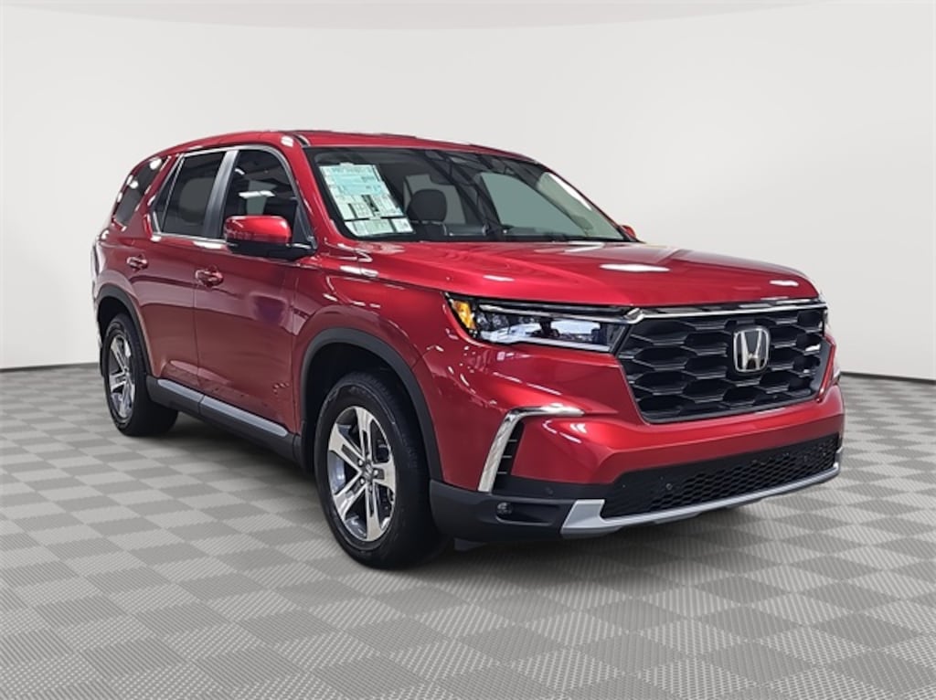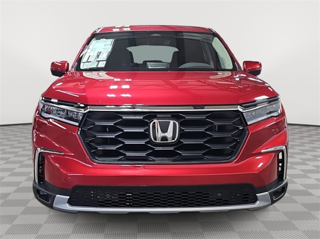 This 2025 Honda Pilot EX-L in Radiant Red Metallic II features: 3rd row seats: split-bench, 4-Wheel Disc Brakes, 4.167 Axle Ratio, 9 Speakers, ABS brakes, Adaptive Cruise Control: Adaptive Cruise Control (ACC) with Low-Speed Follow, Air Conditioning, Alloy wheels, AM/FM radio: SiriusXM, Apple CarPlay/Android Auto, Auto High-beam Headlights, Auto-dimming Rear-View mirror, Automatic temperature control, Blind Spot Information (BSI) System warning, Brake assist, Bumpers: body-color, Delay-off headlights, Driver door bin, Driver vanity mirror, Dual front impact airbags, Dual front side impact airbags, Electronic Stability Control, Emergency communication system: HondaLink Assist, Exterior Parking Camera Rear, Four wheel independent suspension, Front anti-roll bar, Front Bucket Seats, Front Center Armrest, Front dual zone A/C, Front fog lights, Front reading lights, Fully automatic headlights, Garage door transmitter: HomeLink, Heated door mirrors, Heated Front Bucket Seats, Heated front seats, Illuminated entry, Knee airbag, Lane departure: Lane Keeping Assist System (LKAS) active, Leather Seat Trim, Low tire pressure warning, Memory seat, Occupant sensing airbag, Outside temperature display, Overhead airbag, Overhead console, Panic alarm, Passenger door bin, Passenger vanity mirror, Power door mirrors, Power driver seat, Power Liftgate, Power passenger seat, Power steering, Power windows, Radio data system, Radio: 245-Watt Audio System, Rear air conditioning, Rear anti-roll bar, Rear reading lights, Rear seat center armrest, Rear window defroster, Rear window wiper, Reclining 3rd row seat, Remote keyless entry, Security system, SiriusXM, Speed control, Speed-sensing steering, Speed-Sensitive Wipers, Split folding rear seat, Spoiler, Steering wheel mounted audio controls, Tachometer, Telescoping steering wheel, Tilt steering wheel, Traction control, Trip computer, Turn signal indicator mirrors, Variably intermittent wipers, Wheels: 18" Pewter Gray Machined Face.