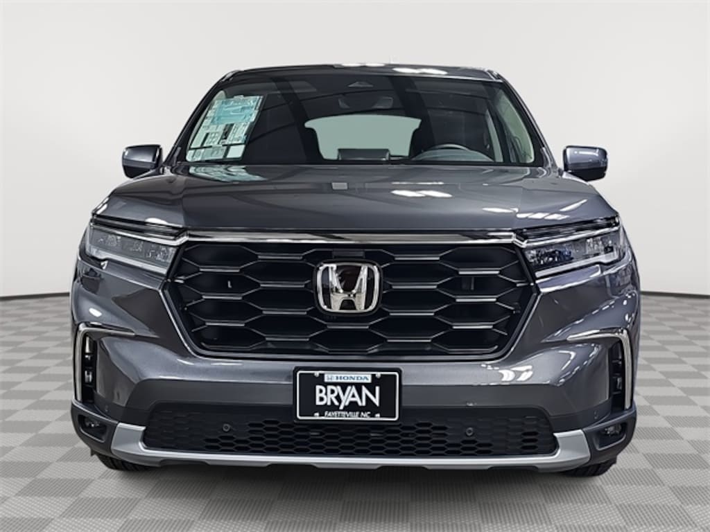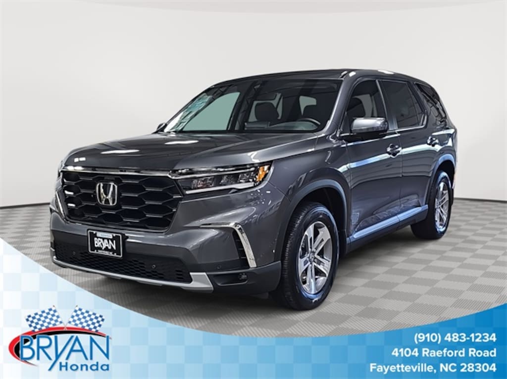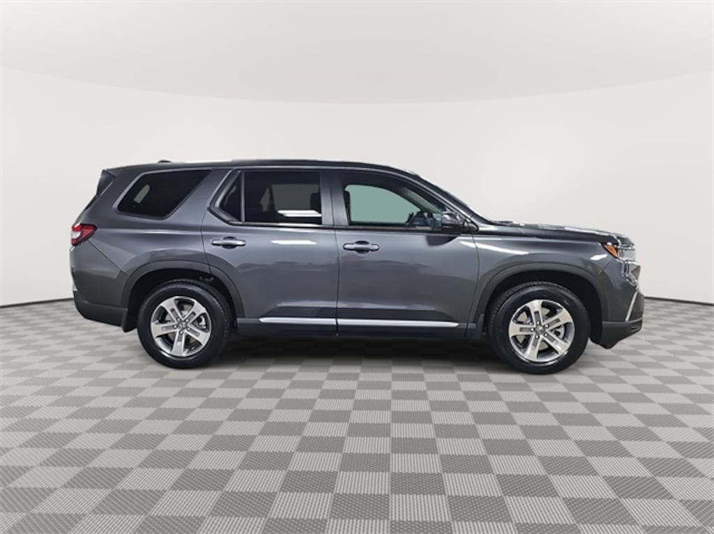 This 2025 Honda Pilot EX-L in Modern Steel Metallic features: 3rd row seats: split-bench, 4-Wheel Disc Brakes, 4.167 Axle Ratio, 9 Speakers, ABS brakes, Adaptive Cruise Control: Adaptive Cruise Control (ACC) with Low-Speed Follow, Air Conditioning, Alloy wheels, AM/FM radio: SiriusXM, Apple CarPlay/Android Auto, Auto High-beam Headlights, Auto-dimming Rear-View mirror, Automatic temperature control, Blind Spot Information (BSI) System warning, Brake assist, Bumpers: body-color, Delay-off headlights, Driver door bin, Driver vanity mirror, Dual front impact airbags, Dual front side impact airbags, Electronic Stability Control, Emergency communication system: HondaLink Assist, Exterior Parking Camera Rear, Four wheel independent suspension, Front anti-roll bar, Front Bucket Seats, Front Center Armrest, Front dual zone A/C, Front fog lights, Front reading lights, Fully automatic headlights, Garage door transmitter: HomeLink, Heated door mirrors, Heated Front Bucket Seats, Heated front seats, Illuminated entry, Knee airbag, Lane departure: Lane Keeping Assist System (LKAS) active, Leather Seat Trim, Low tire pressure warning, Memory seat, Occupant sensing airbag, Outside temperature display, Overhead airbag, Overhead console, Panic alarm, Passenger door bin, Passenger vanity mirror, Power door mirrors, Power driver seat, Power Liftgate, Power passenger seat, Power steering, Power windows, Radio data system, Radio: 245-Watt Audio System, Rear air conditioning, Rear anti-roll bar, Rear reading lights, Rear seat center armrest, Rear window defroster, Rear window wiper, Reclining 3rd row seat, Remote keyless entry, Security system, SiriusXM, Speed control, Speed-sensing steering, Speed-Sensitive Wipers, Split folding rear seat, Spoiler, Steering wheel mounted audio controls, Tachometer, Telescoping steering wheel, Tilt steering wheel, Traction control, Trip computer, Turn signal indicator mirrors, Variably intermittent wipers, Wheels: 18" Pewter Gray Machined Face.
