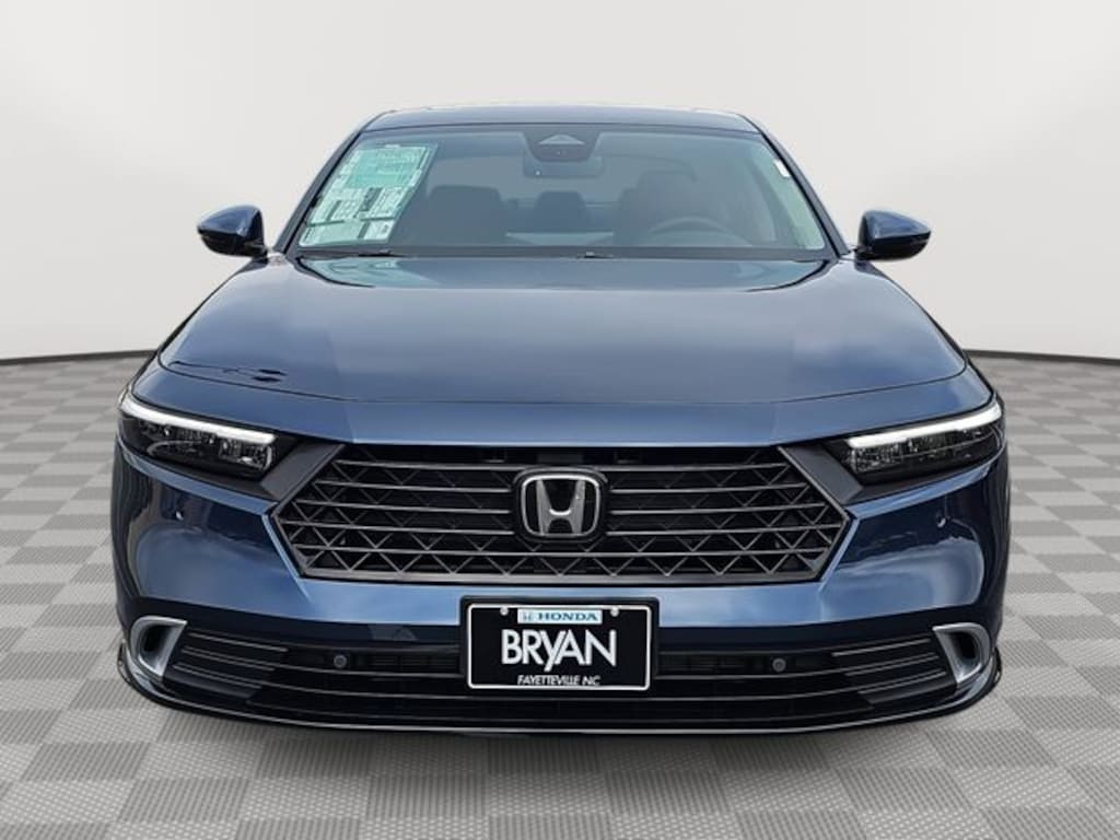 This 2026 Honda Accord Hybrid Touring in Canyon River Blue Metallic features: 2.0L I4 DOHC 16V, 2.0L I4 DOHC 16V, 12 Speakers, 4-Wheel Disc Brakes, ABS brakes, Adaptive Cruise Control: Adaptive Cruise Control (ACC) with Low-Speed Follow, Air Conditioning, Alloy wheels, AM/FM radio, Apple CarPlay/Android Auto, Auto High-beam Headlights, Auto-dimming Rear-View mirror, Automatic temperature control, Blind Spot Information (BSI) System warning, Bose Premium Sound System, Brake assist, Bumpers: body-color, Compass, Delay-off headlights, Driver door bin, Driver vanity mirror, Dual front impact airbags, Dual front side impact airbags, Electronic Stability Control, Emergency communication system: HondaLink, Exterior Parking Camera Rear, Four wheel independent suspension, Front anti-roll bar, Front Bucket Seats, Front Center Armrest, Front dual zone A/C, Front reading lights, Fully automatic headlights, Heads-Up Display, Heated and Ventilated Front Bucket Seats, Heated door mirrors, Heated front seats, Heated rear seats, Heated steering wheel, Illuminated entry, Knee airbag, Lane departure: Lane Keeping Assist System (LKAS) active, Leather Shift Knob, Leather steering wheel, Leather-Trimmed Seat Trim, Low tire pressure warning, Memory seat, Navigation System, Occupant sensing airbag, Outside temperature display, Overhead airbag, Overhead console, Panic alarm, Passenger door bin, Passenger vanity mirror, Power door mirrors, Power driver seat, Power moonroof, Power passenger seat, Power steering, Power windows, Radio data system, Rain sensing wipers, Rear anti-roll bar, Rear reading lights, Rear seat center armrest, Rear side impact airbag, Rear window defroster, Remote keyless entry, Security system, Speed control, Speed-sensing steering, Speed-Sensitive Wipers, Split folding rear seat, Steering wheel mounted audio controls, Telescoping steering wheel, Tilt steering wheel, Traction control, Trip computer, Turn signal indicator mirrors, Variably intermittent wipers, Ventilated front seats, Wheels: 19" x 8.5J Berlina Black.