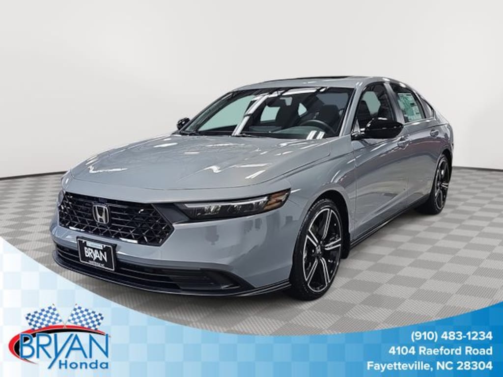 This 2026 Honda Accord Hybrid Sport in Urban Gray Pearl features: 2.0L I4 DOHC 16V, 2.0L I4 DOHC 16V, 4-Wheel Disc Brakes, 8 Speakers, ABS brakes, Adaptive Cruise Control: Adaptive Cruise Control (ACC) with Low-Speed Follow, Air Conditioning, Alloy wheels, AM/FM radio, Apple CarPlay/Android Auto, Auto High-beam Headlights, Automatic temperature control, Blind Spot Information (BSI) System warning, Brake assist, Bumpers: body-color, Compass, Delay-off headlights, Driver door bin, Driver vanity mirror, Dual front impact airbags, Dual front side impact airbags, Electronic Stability Control, Emergency communication system: HondaLink, Exterior Parking Camera Rear, Fabric Seat Trim, Four wheel independent suspension, Front anti-roll bar, Front Bucket Seats, Front Center Armrest, Front dual zone A/C, Front reading lights, Fully automatic headlights, Heated Front Bucket Seats, Heated front seats, Illuminated entry, Knee airbag, Lane departure: Lane Keeping Assist System (LKAS) active, Leather Shift Knob, Leather steering wheel, Low tire pressure warning, Occupant sensing airbag, Outside temperature display, Overhead airbag, Overhead console, Panic alarm, Passenger door bin, Passenger vanity mirror, Power door mirrors, Power driver seat, Power moonroof, Power steering, Power windows, Radio data system, Radio: 180-Watt Audio System, Rear anti-roll bar, Rear reading lights, Rear seat center armrest, Rear side impact airbag, Rear window defroster, Remote keyless entry, Security system, Speed control, Speed-sensing steering, Speed-Sensitive Wipers, Split folding rear seat, Spoiler, Steering wheel mounted audio controls, Telescoping steering wheel, Tilt steering wheel, Traction control, Trip computer, Variably intermittent wipers, Wheels: 19" x 8.5J Berlina Black.