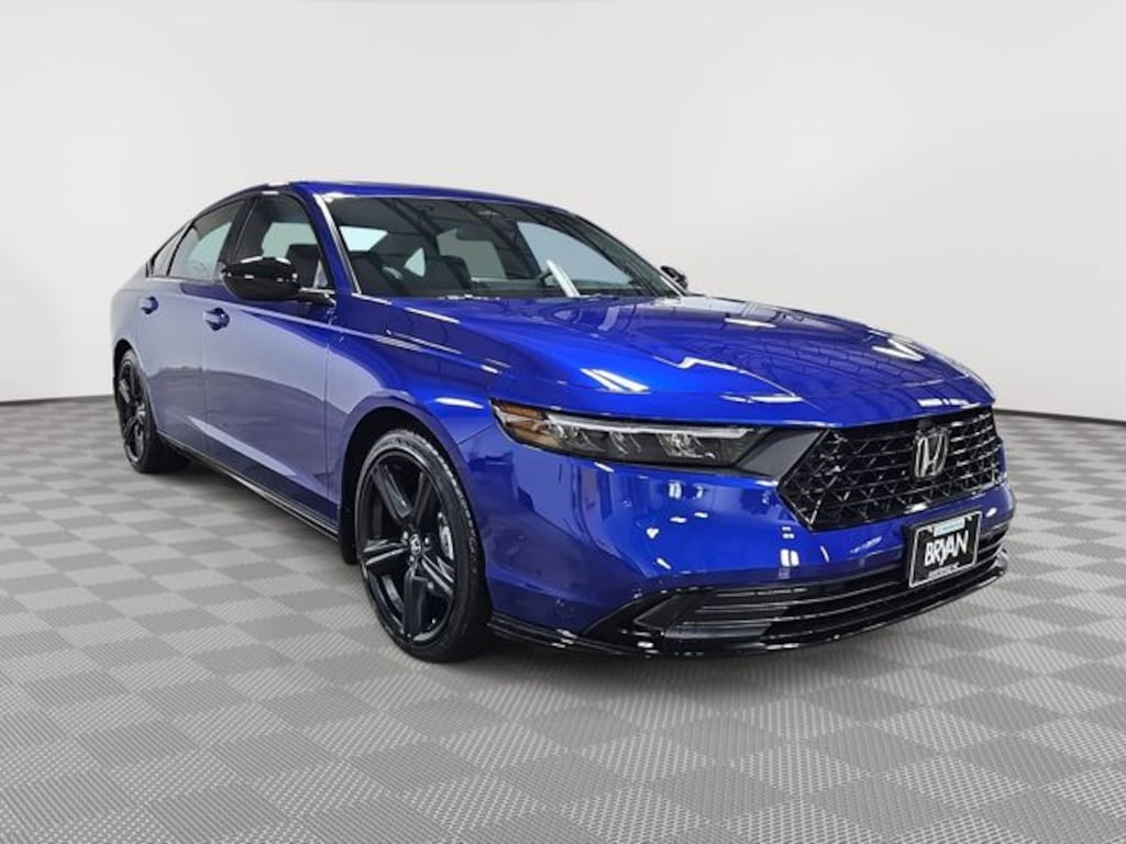 This 2026 Honda Accord Hybrid Sport-L in Still Night Pearl features: 2.0L I4 DOHC 16V, 2.0L I4 DOHC 16V, 4-Wheel Disc Brakes, 8 Speakers, ABS brakes, Adaptive Cruise Control: Adaptive Cruise Control (ACC) with Low-Speed Follow, Air Conditioning, Alloy wheels, AM/FM radio, Apple CarPlay/Android Auto, Auto High-beam Headlights, Automatic temperature control, Blind Spot Information (BSI) System warning, Brake assist, Bumpers: body-color, Compass, Delay-off headlights, Driver door bin, Driver vanity mirror, Dual front impact airbags, Dual front side impact airbags, Electronic Stability Control, Emergency communication system: HondaLink, Exterior Parking Camera Rear, Four wheel independent suspension, Front anti-roll bar, Front Bucket Seats, Front Center Armrest, Front dual zone A/C, Front reading lights, Fully automatic headlights, Heated Front Bucket Seats, Heated front seats, Illuminated entry, Knee airbag, Lane departure: Lane Keeping Assist System (LKAS) active, Leather Shift Knob, Leather steering wheel, Leather-Trimmed Seat Trim, Low tire pressure warning, Memory seat, Occupant sensing airbag, Outside temperature display, Overhead airbag, Overhead console, Panic alarm, Passenger door bin, Passenger vanity mirror, Power door mirrors, Power driver seat, Power moonroof, Power passenger seat, Power steering, Power windows, Radio data system, Radio: 180-Watt Audio System, Rear anti-roll bar, Rear reading lights, Rear seat center armrest, Rear side impact airbag, Rear window defroster, Remote keyless entry, Security system, Speed control, Speed-sensing steering, Speed-Sensitive Wipers, Split folding rear seat, Spoiler, Steering wheel mounted audio controls, Telescoping steering wheel, Tilt steering wheel, Traction control, Trip computer, Variably intermittent wipers, Wheels: 19" x 8.5J Matte Berlina Black.
