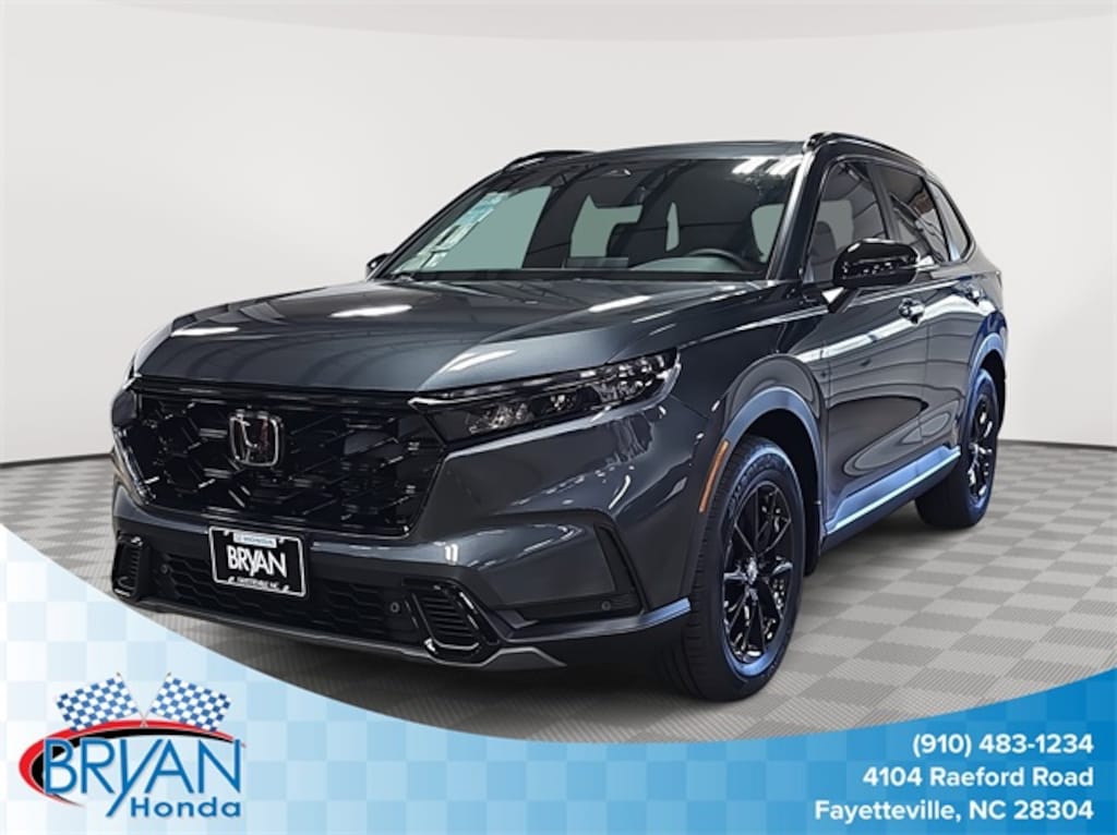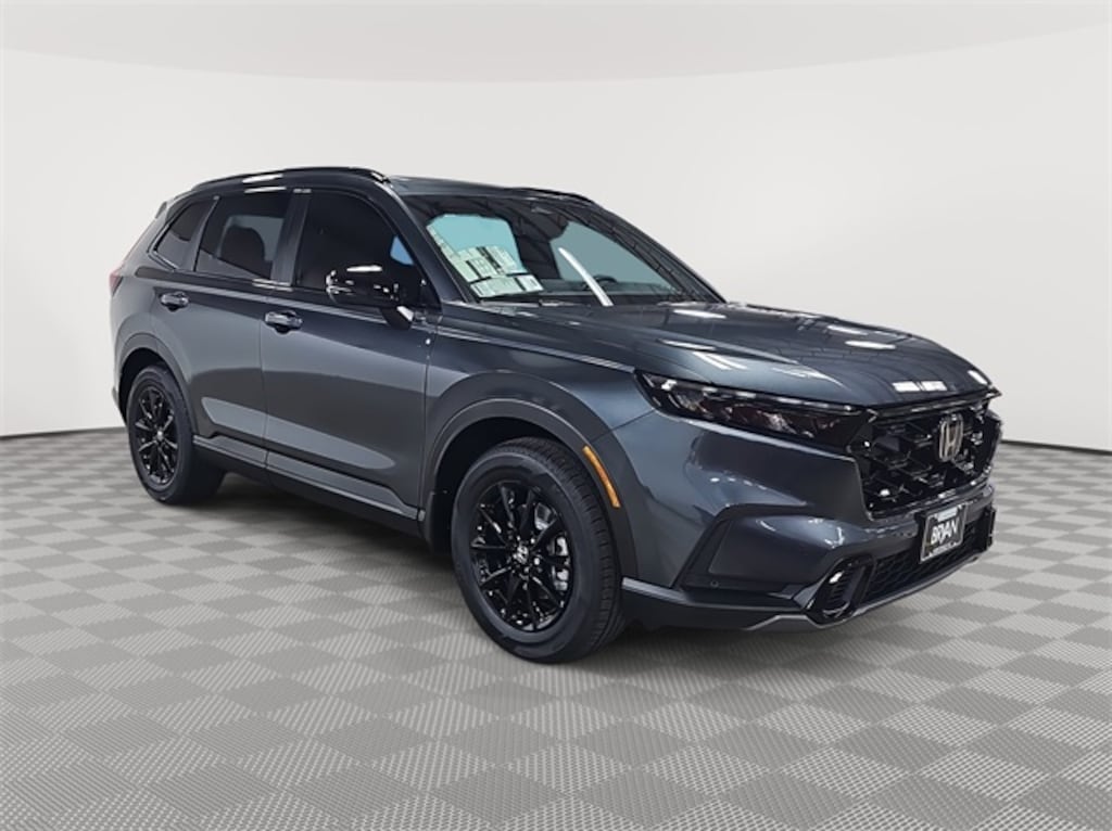 This 2026 Honda CR-V Hybrid Sport-L in Meteorite Gray Metallic features: 2.0L I4 DOHC 16V, 2.0L I4 DOHC 16V, 4-Wheel Disc Brakes, 8 Speakers, ABS brakes, Adaptive Cruise Control: Adaptive Cruise Control (ACC) with Low-Speed Follow, Air Conditioning, Alloy wheels, Apple CarPlay/Android Auto, Auto High-beam Headlights, Auto-dimming Rear-View mirror, Automatic temperature control, Blind Spot Information (BSI) System warning, Brake assist, Bumpers: body-color, Compass, Delay-off headlights, Driver door bin, Driver vanity mirror, Dual front impact airbags, Dual front side impact airbags, Electronic Stability Control, Exterior Parking Camera Rear, Four wheel independent suspension, Front anti-roll bar, Front Bucket Seats, Front Center Armrest, Front dual zone A/C, Front reading lights, Fully automatic headlights, Heated door mirrors, Heated Front Bucket Seats, Heated front seats, Illuminated entry, Knee airbag, Leather Seat Trim, Leather Shift Knob, Leather steering wheel, Low tire pressure warning, Memory seat, Occupant sensing airbag, Outside temperature display, Overhead airbag, Overhead console, Panic alarm, Passenger door bin, Passenger vanity mirror, Power door mirrors, Power driver seat, Power Liftgate, Power moonroof, Power passenger seat, Power steering, Power windows, Radio data system, Radio: 320-Watt AM/FM Audio System, Rear anti-roll bar, Rear reading lights, Rear seat center armrest, Rear side impact airbag, Rear window defroster, Rear window wiper, Remote keyless entry, Security system, Speed control, Speed-sensing steering, Speed-Sensitive Wipers, Split folding rear seat, Spoiler, Steering wheel mounted audio controls, Telescoping steering wheel, Tilt steering wheel, Traction control, Trip computer, Turn signal indicator mirrors, Variably intermittent wipers, Wheels: 18" Berlina Black.