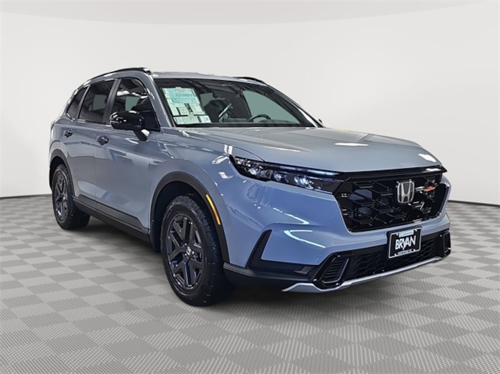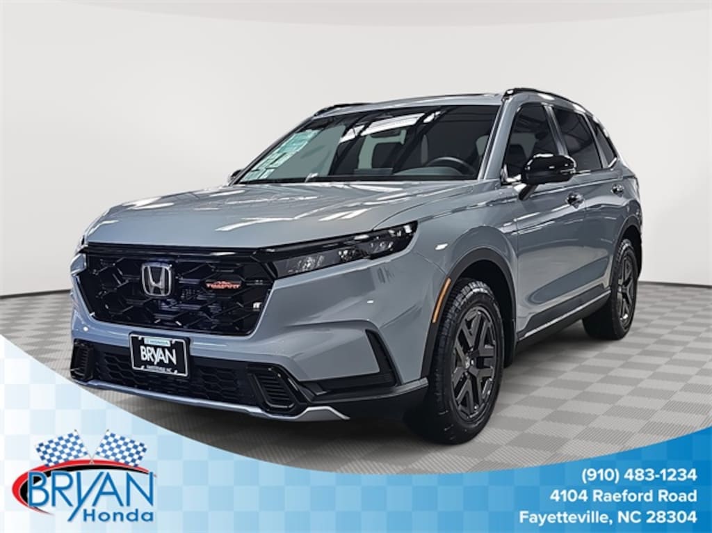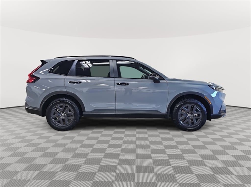This 2026 Honda CR-V Hybrid TrailSport in Urban Gray Pearl features: 2.0L I4 DOHC 16V, 2.0L I4 DOHC 16V, 4-Wheel Disc Brakes, 8 Speakers, ABS brakes, Adaptive Cruise Control: Adaptive Cruise Control (ACC) with Low-Speed Follow, Air Conditioning, Alloy wheels, AM/FM radio, Apple CarPlay/Android Auto, Auto High-beam Headlights, Automatic temperature control, Blind Spot Information (BSI) System warning, Brake assist, Bumpers: body-color, Cloth Seat Trim, Compass, Delay-off headlights, Driver door bin, Driver vanity mirror, Dual front impact airbags, Dual front side impact airbags, Electronic Stability Control, Exterior Parking Camera Rear, Four wheel independent suspension, Front anti-roll bar, Front Bucket Seats, Front Center Armrest, Front dual zone A/C, Front reading lights, Fully automatic headlights, Heated door mirrors, Heated Front Bucket Seats, Heated front seats, Heated steering wheel, Illuminated entry, Knee airbag, Leather Shift Knob, Leather steering wheel, Low tire pressure warning, Occupant sensing airbag, Outside temperature display, Overhead airbag, Overhead console, Panic alarm, Passenger door bin, Passenger vanity mirror, Power door mirrors, Power driver seat, Power moonroof, Power steering, Power windows, Radio data system, Radio: 320-Watt AM/FM Audio System, Rear anti-roll bar, Rear reading lights, Rear seat center armrest, Rear side impact airbag, Rear window defroster, Rear window wiper, Remote keyless entry, Security system, Speed control, Speed-sensing steering, Speed-Sensitive Wipers, Split folding rear seat, Spoiler, Steering wheel mounted audio controls, Telescoping steering wheel, Tilt steering wheel, Traction control, Trip computer, Turn signal indicator mirrors, Variably intermittent wipers, Wheels: 18" Shark Grey.
