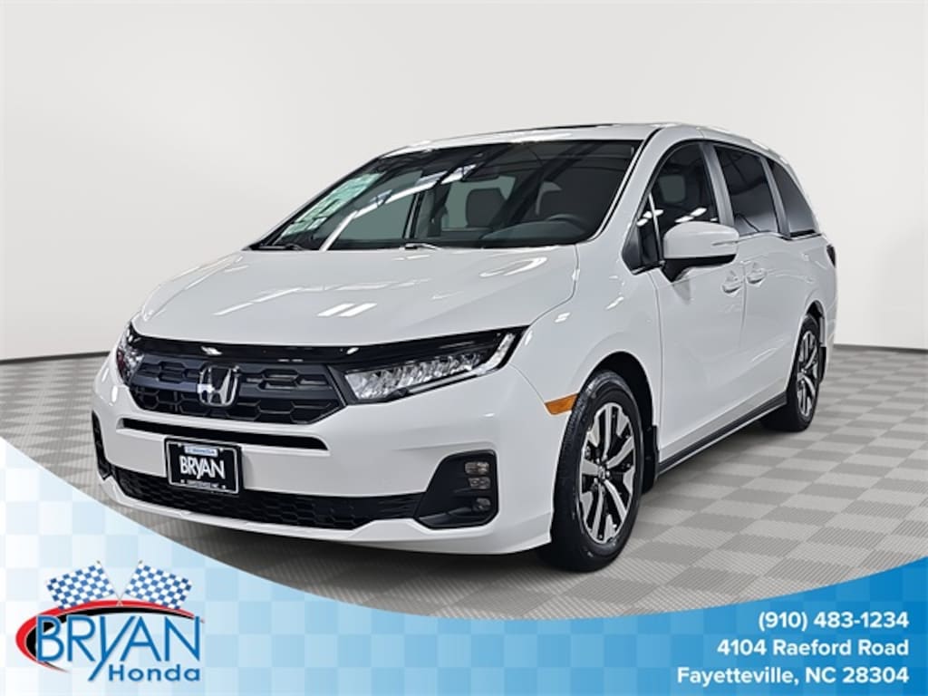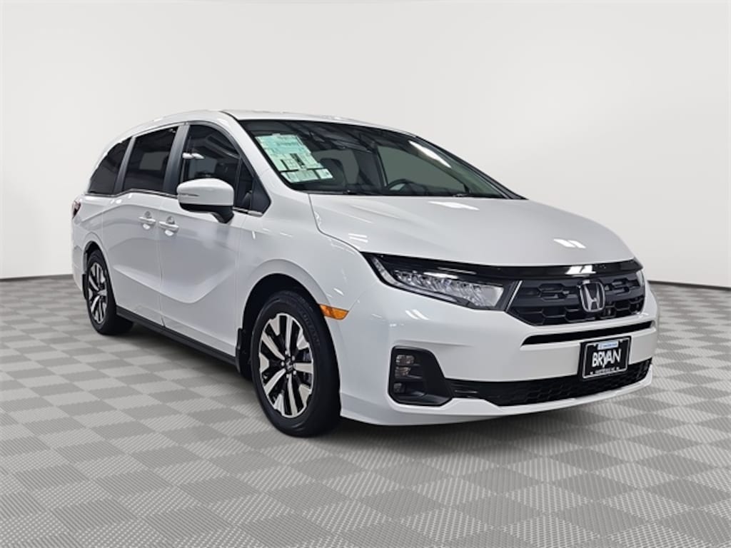 This 2026 Honda Odyssey EX-L in Platinum White Pearl features: 18" Machine-Finished Alloy Wheels, 3rd row seats: split-bench, 4-Wheel Disc Brakes, 7 Speakers, ABS brakes, Adaptive Cruise Control: Adaptive Cruise Control (ACC) with Low-Speed Follow, Air Conditioning, Alloy wheels, AM/FM radio: SiriusXM, Anti-whiplash front head restraints, Apple CarPlay/Android Auto, Auto High-beam Headlights, Auto-dimming Rear-View mirror, Automatic temperature control, Blind Spot Information (BSI) System warning, Brake assist, Bumpers: body-color, Delay-off headlights, Driver door bin, Driver vanity mirror, Driver's Seat Mounted Armrest, Dual front impact airbags, Dual front side impact airbags, Electronic Stability Control, Exterior Parking Camera Rear, Four wheel independent suspension, Front anti-roll bar, Front Bucket Seats, Front dual zone A/C, Front fog lights, Front reading lights, Fully automatic headlights, Garage door transmitter: HomeLink, Heated door mirrors, Heated Front Bucket Seats, Heated front seats, Illuminated entry, Knee airbag, Lane departure: Lane Keeping Assist System (LKAS) active, Leather steering wheel, Leather-Trimmed Seats, Low tire pressure warning, Memory seat, Occupant sensing airbag, Outside temperature display, Overhead airbag, Overhead console, Panic alarm, Passenger door bin, Passenger seat mounted armrest, Passenger vanity mirror, Power door mirrors, Power driver seat, Power Liftgate, Power moonroof, Power passenger seat, Power steering, Power windows, Radio data system, Radio: 160-Watt AM/FM/HD/SiriusXM Audio System, Rear air conditioning, Rear anti-roll bar, Rear reading lights, Rear seat center armrest, Rear window defroster, Rear window wiper, Reclining 3rd row seat, Remote keyless entry, Security system, Speed control, Speed-sensing steering, Speed-Sensitive Wipers, Split folding rear seat, Spoiler, Steering wheel mounted audio controls, Tachometer, Telescoping steering wheel, Tilt steering wheel, Traction control, Trip computer, Turn signal indicator mirrors, Variably intermittent wipers.