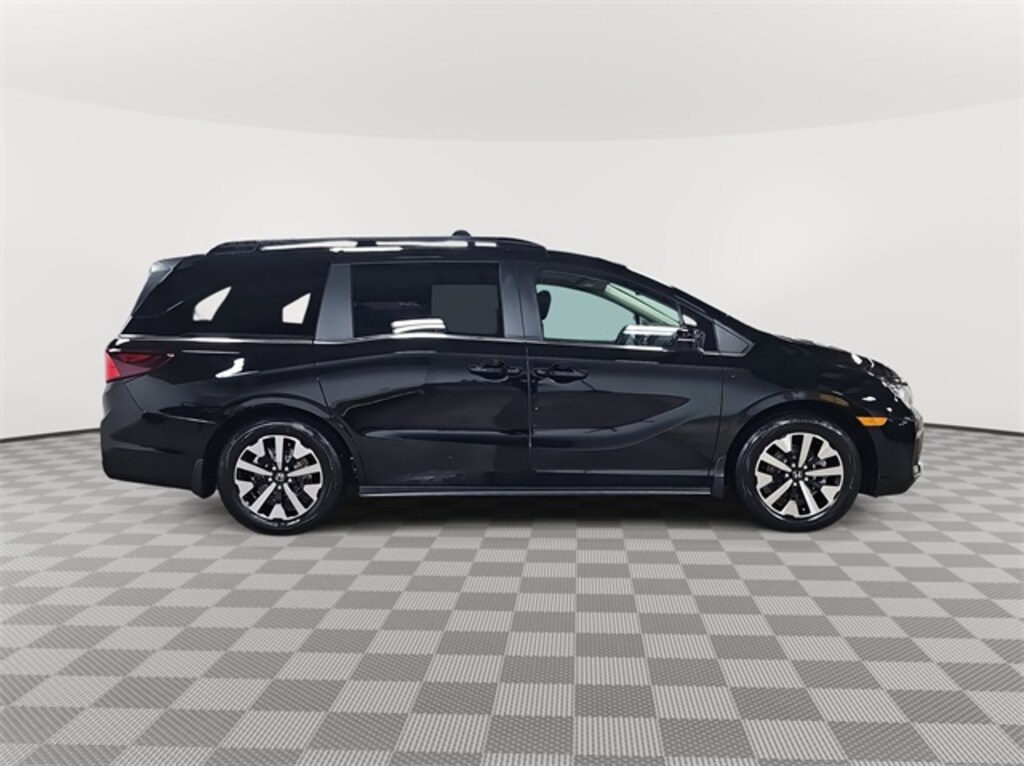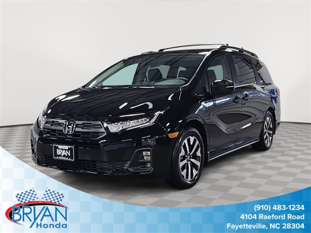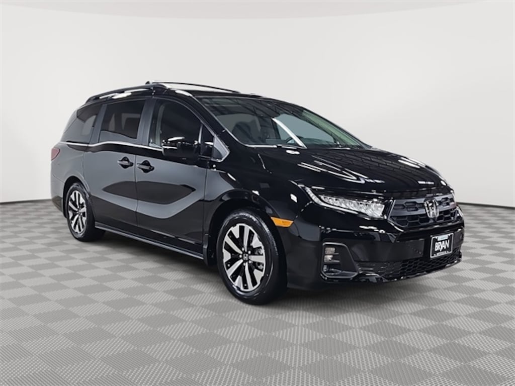 This 2026 Honda Odyssey EX-L in Crystal Black Pearl features: 18" Machine-Finished Alloy Wheels, 3rd row seats: split-bench, 4-Wheel Disc Brakes, 7 Speakers, ABS brakes, Adaptive Cruise Control: Adaptive Cruise Control (ACC) with Low-Speed Follow, Air Conditioning, Alloy wheels, AM/FM radio: SiriusXM, Anti-whiplash front head restraints, Apple CarPlay/Android Auto, Auto High-beam Headlights, Auto-dimming Rear-View mirror, Automatic temperature control, Blind Spot Information (BSI) System warning, Brake assist, Bumpers: body-color, Delay-off headlights, Driver door bin, Driver vanity mirror, Driver's Seat Mounted Armrest, Dual front impact airbags, Dual front side impact airbags, Electronic Stability Control, Exterior Parking Camera Rear, Four wheel independent suspension, Front anti-roll bar, Front Bucket Seats, Front dual zone A/C, Front fog lights, Front reading lights, Fully automatic headlights, Garage door transmitter: HomeLink, Heated door mirrors, Heated Front Bucket Seats, Heated front seats, Illuminated entry, Knee airbag, Lane departure: Lane Keeping Assist System (LKAS) active, Leather steering wheel, Leather-Trimmed Seats, Low tire pressure warning, Memory seat, Occupant sensing airbag, Outside temperature display, Overhead airbag, Overhead console, Panic alarm, Passenger door bin, Passenger seat mounted armrest, Passenger vanity mirror, Power door mirrors, Power driver seat, Power Liftgate, Power moonroof, Power passenger seat, Power steering, Power windows, Radio data system, Radio: 160-Watt AM/FM/HD/SiriusXM Audio System, Rear air conditioning, Rear anti-roll bar, Rear reading lights, Rear seat center armrest, Rear window defroster, Rear window wiper, Reclining 3rd row seat, Remote keyless entry, Security system, Speed control, Speed-sensing steering, Speed-Sensitive Wipers, Split folding rear seat, Spoiler, Steering wheel mounted audio controls, Tachometer, Telescoping steering wheel, Tilt steering wheel, Traction control, Trip computer, Turn signal indicator mirrors, Variably intermittent wipers.