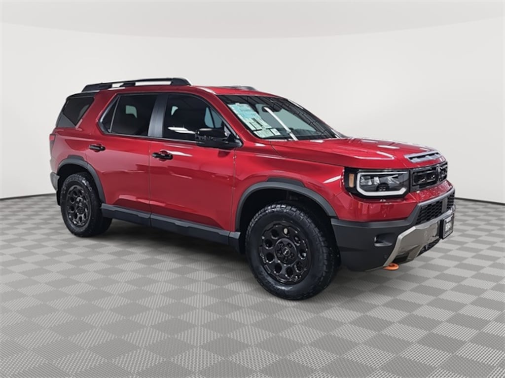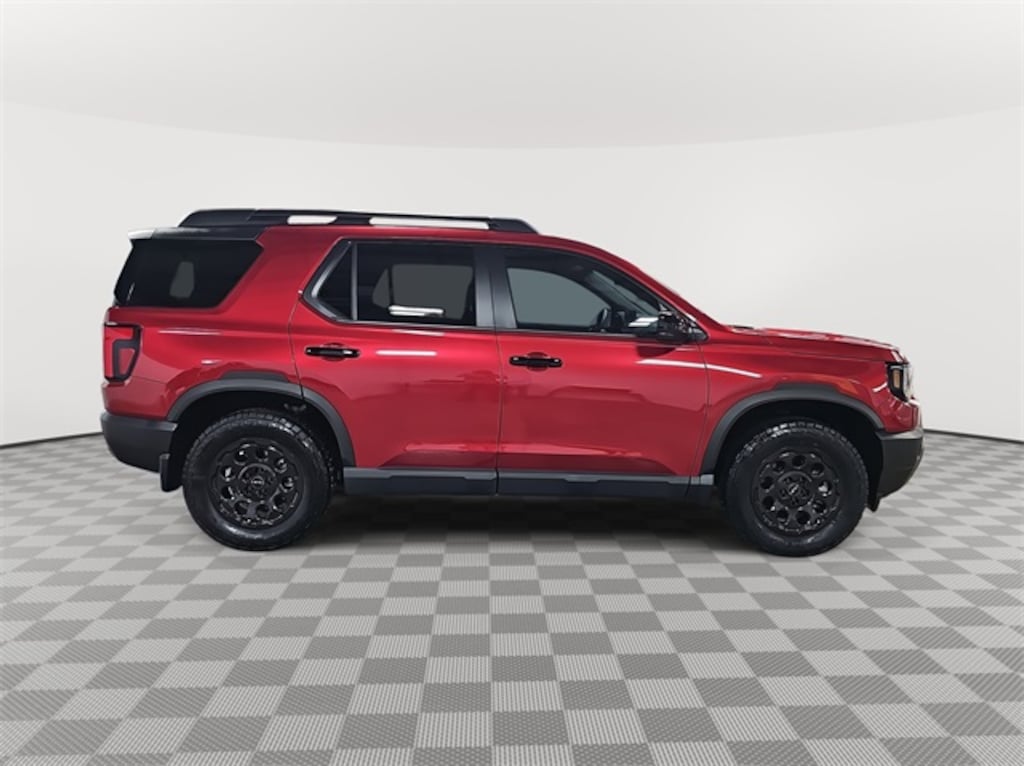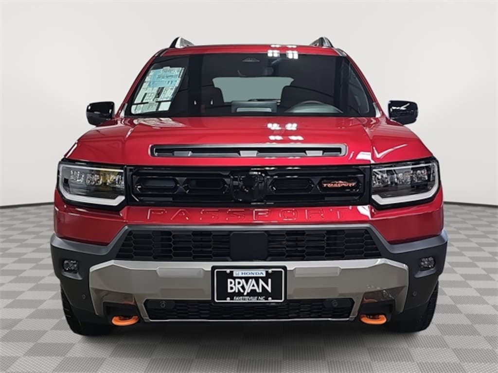 This 2026 Honda Passport TrailSport Blackout in Radiant Red Metallic II features: 4-Wheel Disc Brakes, 9 Speakers, ABS brakes, Adaptive Cruise Control: Adaptive Cruise Control (ACC) with Low-Speed Follow, Air Conditioning, Alloy wheels, Apple CarPlay/Android Auto, Auto High-beam Headlights, Auto-dimming Rear-View mirror, Automatic temperature control, Blind Spot Information (BSI) System warning, Brake assist, Compass, Delay-off headlights, Driver door bin, Driver vanity mirror, Driver's Seat Mounted Armrest, Dual front impact airbags, Dual front side impact airbags, Durable Leatherette & Cloth Seat Trim, Electronic Stability Control, Emergency communication system: HondaLink, Exterior Parking Camera Rear, Four wheel independent suspension, Front anti-roll bar, Front Bucket Seats, Front Center Armrest, Front dual zone A/C, Front fog lights, Front reading lights, Fully automatic headlights, Heated door mirrors, Heated Front Bucket Seats, Heated front seats, HVAC memory, Illuminated entry, Knee airbag, Lane departure: Lane Keeping Assist System (LKAS) active, Leather steering wheel, Low tire pressure warning, Memory seat, Navigation system: Google Maps, Occupant sensing airbag, Outside temperature display, Overhead airbag, Overhead console, Panic alarm, Passenger door bin, Passenger seat mounted armrest, Passenger vanity mirror, Power door mirrors, Power driver seat, Power Liftgate, Power moonroof, Power passenger seat, Power steering, Power windows, Radio data system, Radio: Audio System w/9 Speakers, Rear air conditioning, Rear anti-roll bar, Rear reading lights, Rear seat center armrest, Rear window defroster, Rear window wiper, Remote keyless entry, Security system, Speed control, Speed-sensing steering, Split folding rear seat, Spoiler, Steering wheel mounted audio controls, Tachometer, Telescoping steering wheel, Tilt steering wheel, Traction control, Trip computer, Turn signal indicator mirrors, Variably intermittent wipers, Wheels: 18" HPD Black Alloy.