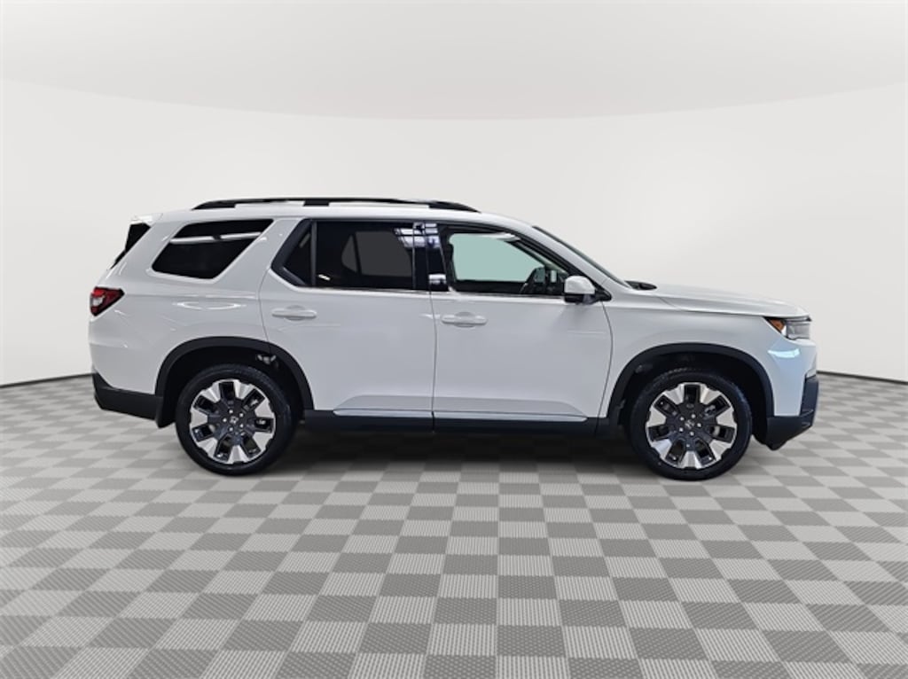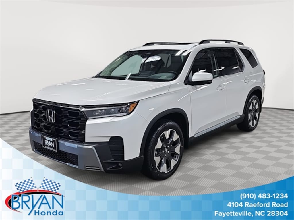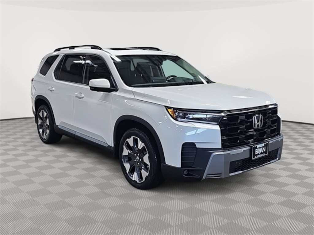 This 2026 Honda Pilot Elite in Platinum White Pearl features: AWD, AWD, 12 Speakers, 3rd row seats: split-bench, 4-Wheel Disc Brakes, ABS brakes, Adaptive Cruise Control: Adaptive Cruise Control (ACC) with Low-Speed Follow, Air Conditioning, Alloy wheels, Apple CarPlay/Android Auto, Auto High-beam Headlights, Auto-dimming door mirrors, Auto-dimming Rear-View mirror, Automatic temperature control, Blind Spot Information (BSI) System warning, Bose Premium Sound System, Brake assist, Bumpers: body-color, Compass, Delay-off headlights, Driver door bin, Driver vanity mirror, Dual front impact airbags, Dual front side impact airbags, Electronic Stability Control, Emergency communication system: HondaLink, Exterior Parking Camera Rear, Four wheel independent suspension, Front anti-roll bar, Front Bucket Seats, Front Center Armrest, Front dual zone A/C, Front fog lights, Front reading lights, Fully automatic headlights, Garage door transmitter: HomeLink, Heads-Up Display, Heated and Ventilated Front Bucket Seats, Heated door mirrors, Heated front seats, Heated rear seats, Heated steering wheel, HondaLink, HondaLink Subscription Services, Illuminated entry, Knee airbag, Lane departure: Lane Keeping Assist System (LKAS) active, Low tire pressure warning, Memory seat, Navigation system: Google Maps, Occupant sensing airbag, Outside temperature display, Overhead airbag, Overhead console, Panic alarm, Passenger door bin, Passenger vanity mirror, Perforated Leather-Trimmed Seat Trim, Power door mirrors, Power driver seat, Power Liftgate, Power moonroof, Power passenger seat, Power steering, Power windows, Radio data system, Rain sensing wipers, Rear air conditioning, Rear anti-roll bar, Rear reading lights, Rear seat center armrest, Rear window defroster, Rear window wiper, Reclining 3rd row seat, Remote keyless entry, Security system, Speed control, Speed-sensing steering, Speed-Sensitive Wipers, Split folding rear seat, Spoiler, Steering wheel mounted audio controls, Tachometer, Telescoping steering wheel, Tilt steering wheel, Traction control, Trip computer, Turn signal indicator mirrors, Variably intermittent wipers, Ventilated front seats, Wheels: 20" Shark Gray Machined Face with Black Lug Nuts.