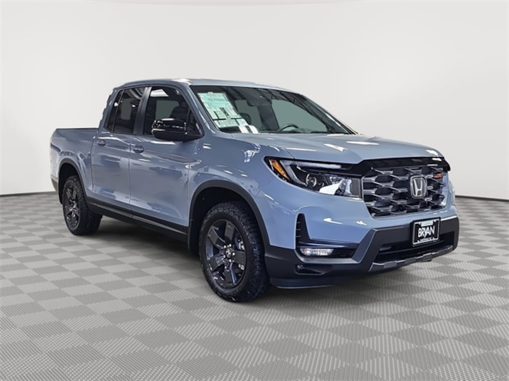 This 2026 Honda Ridgeline TrailSport in Sonic Gray Pearl features: Black w/Leather Seat Trim, Black w/Leather Seat Trim, 4-Wheel Disc Brakes, 4.33 Axle Ratio, 7 Speakers, ABS brakes, Air Conditioning, Alloy wheels, AM/FM radio: SiriusXM, Auto-dimming Rear-View mirror, Automatic temperature control, Blind Spot Information (BSI) System warning, Bluetooth® Hands-Free Link, Brake assist, Bumpers: body-color, Compass, Delay-off headlights, Driver door bin, Driver vanity mirror, Driver's Seat Mounted Armrest, Dual front impact airbags, Dual front side impact airbags, Electronic Stability Control, Emergency communication system: HondaLink Assist, Exterior Parking Camera Rear, Four wheel independent suspension, Front anti-roll bar, Front Bucket Seats, Front dual zone A/C, Front fog lights, Front reading lights, Fully automatic headlights, Garage door transmitter: HomeLink, Heated door mirrors, Heated Front Bucket Seats, Heated front seats, Heated steering wheel, Honda Satellite-Linked Navigation System, Illuminated entry, Leather Seat Trim, Leather steering wheel, Low tire pressure warning, Memory seat, Navigation system: Honda Satellite-Linked Navigation System, Occupant sensing airbag, Outside temperature display, Overhead airbag, Overhead console, Panic alarm, Passenger door bin, Passenger seat mounted armrest, Passenger vanity mirror, Power door mirrors, Power driver seat, Power moonroof, Power passenger seat, Power steering, Power windows, Radio data system, Rear air conditioning, Rear anti-roll bar, Rear reading lights, Rear seat center armrest, Rear step bumper, Rear window defroster, Remote keyless entry, Security system, SiriusXM, Speed control, Speed-sensing steering, Split folding rear seat, Steering wheel mounted audio controls, Tachometer, Telescoping steering wheel, Tilt steering wheel, Traction control, Trip computer, Turn signal indicator mirrors, Variably intermittent wipers.