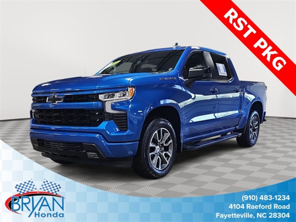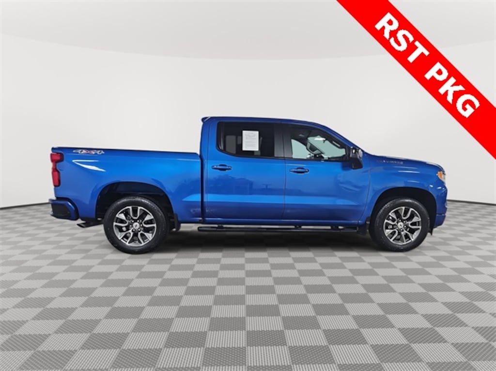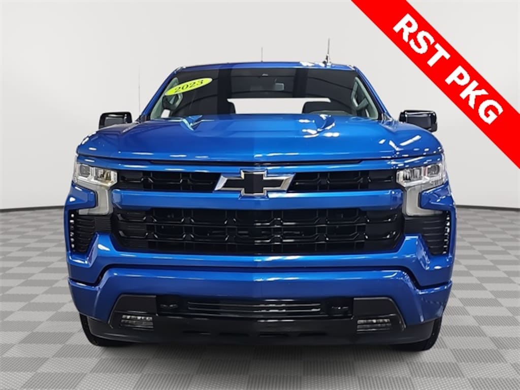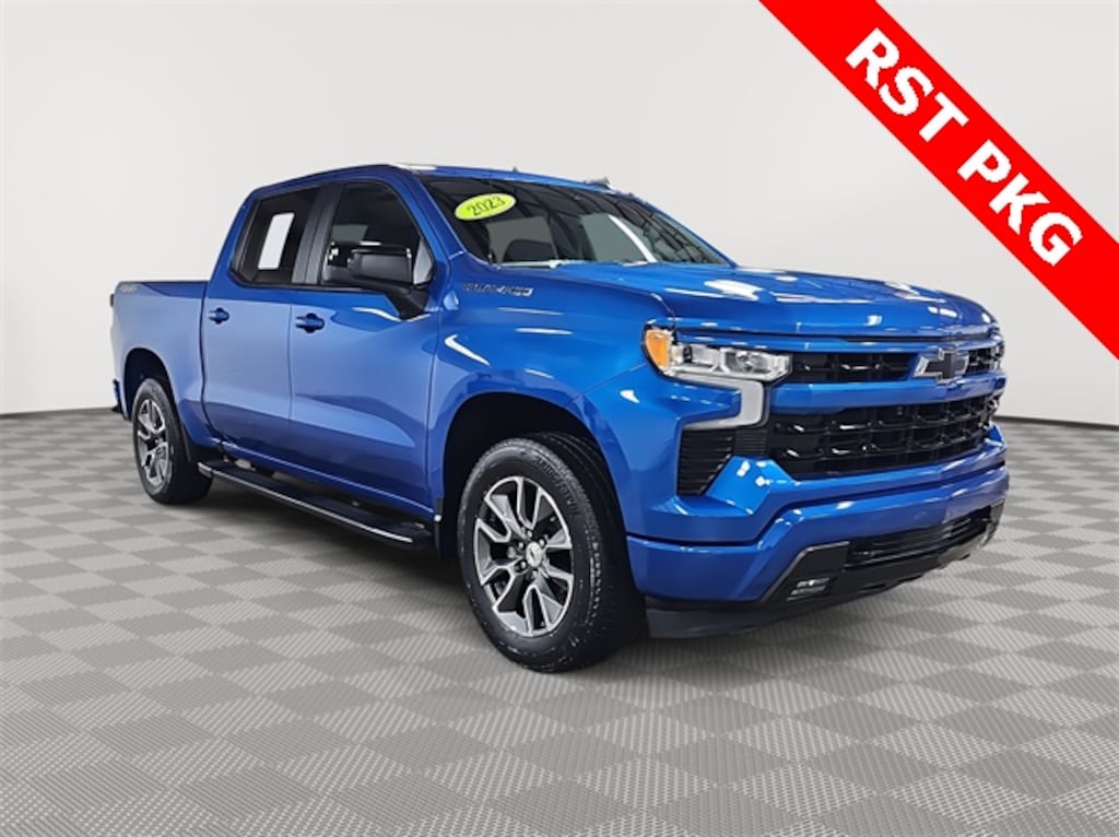 This 2023 Chevrolet Silverado 1500 RST in Glacier Blue Metallic features: 8-Speed Automatic, 4WD, Black Cloth, 8-Speed Automatic, 4WD, Black Cloth, 10-Way Power Driver Seat w/Lumbar, 12.3" Multicolor Reconfigurable Digital Display, 120-Volt Bed Mounted Power Outlet, 120-Volt Instrument Panel Power Outlet, 220 Amp Alternator, 3.42 Rear Axle Ratio, 4-Wheel Disc Brakes, 40/20/40 Front Split-Bench Seat, 6 Speakers, 6-Speaker Audio System, ABS brakes, Air Conditioning, All-Star Edition, Alloy wheels, AM/FM radio: SiriusXM with 360L, Apple CarPlay/Android Auto, Auto High-beam Headlights, Auto-Locking Rear Differential, Automatic Emergency Braking, Automatic temperature control, Bluetooth® For Phone, Brake assist, Bumpers: body-color, Chevrolet Connected Access Capable, Cloth Seat Trim, Color-Keyed Carpeting Floor Covering, Compass, Convenience Package, Deep-Tinted Glass, Delay-off headlights, Driver door bin, Driver vanity mirror, Dual front impact airbags, Dual front side impact airbags, Dual Rear USB Ports (Charge Only), Dual-Zone Automatic Climate Control, Electric Rear-Window Defogger, Electrical Steering Column Lock, Electronic Cruise Control, Electronic Stability Control, EZ Lift Power Lock & Release Tailgate, Following Distance Indicator, Forward Collision Alert, Front anti-roll bar, Front Center Armrest w/Storage, Front dual zone A/C, Front fog lights, Front Frame-Mounted Black Recovery Hooks, Front LED Fog Lamps, Front Pedestrian Braking, Front reading lights, Front Rubberized Vinyl Floor Mats, Front wheel independent suspension, Fully automatic headlights, HD Rear Vision Camera, Heated door mirrors, Heated Driver & Front Outboard Passenger Seats, Heated front seats, Heated Power-Adjustable Outside Mirrors, Heated Steering Wheel, Heated steering wheel, High Capacity Suspension Package, High Gloss Black Mirror Caps, Hitch Guidance, Illuminated entry, Inside Rear-View Mirror w/Tilt, IntelliBeam Automatic High Beam On/Off, Keyless Open & Start, Lane Keep Assist w/Lane Departure Warning, LED Cargo Area Lighting, Low tire pressure warning, Not Equipped w/Steering Column Lock, Occupant sensing airbag, OnStar & Chevrolet Connected Services Capable, Outside temperature display, Overhead airbag, Overhead console, Panic alarm, Passenger door bin, Passenger vanity mirror, Power door mirrors, Power driver seat, Power Front Windows w/Driver Express Up/Down, Power Front Windows w/Passenger Express Down, Power Rear Windows w/Express Down, Power steering, Power windows, Preferred Equipment Group 1SP, Premium audio system: Chevrolet Infotainment 3 Premium, Radio data system, Radio: Chevrolet Infotainment 3 Premium System, Rear 60/40 Folding Bench Seat (Folds Up), Rear reading lights, Rear Rubberized-Vinyl Floor Mats, Rear step bumper, Rear window defroster, Remote keyless entry, Remote Vehicle Starter System, Security system, SiriusXM w/360L, Speed control, Speed-sensing steering, Split folding rear seat, Standard Suspension Package, Standard Tailgate, Steering Wheel Audio Controls, Steering wheel mounted audio controls, Tachometer, Telescoping steering wheel, Theft Deterrent System (Unauthorized Entry), Tilt steering wheel, Traction control, Trailering Package, Trip computer, Variably intermittent wipers, Voltmeter, Wheels: 18" x 8.5" Bright Silver Painted Aluminum, Wheels: 20" x 9" Painted Aluminum, Wi-Fi Hot Spot Capable, Wireless Phone Projection, Wrapped Steering Wheel.