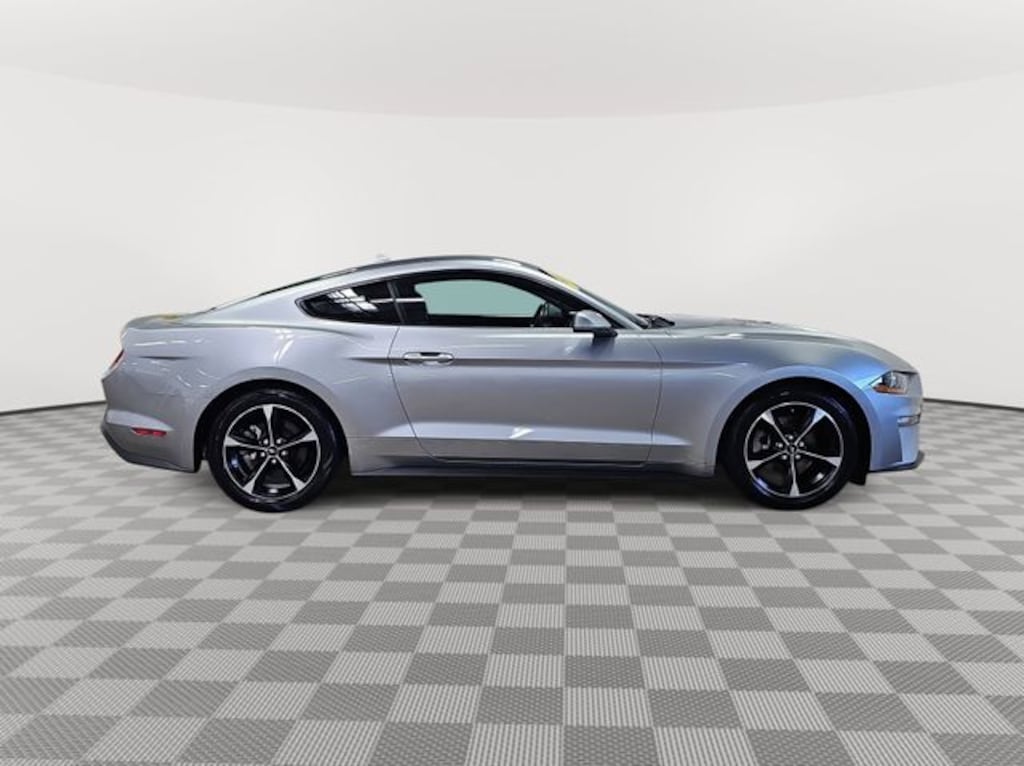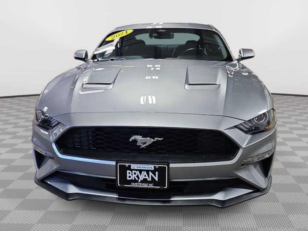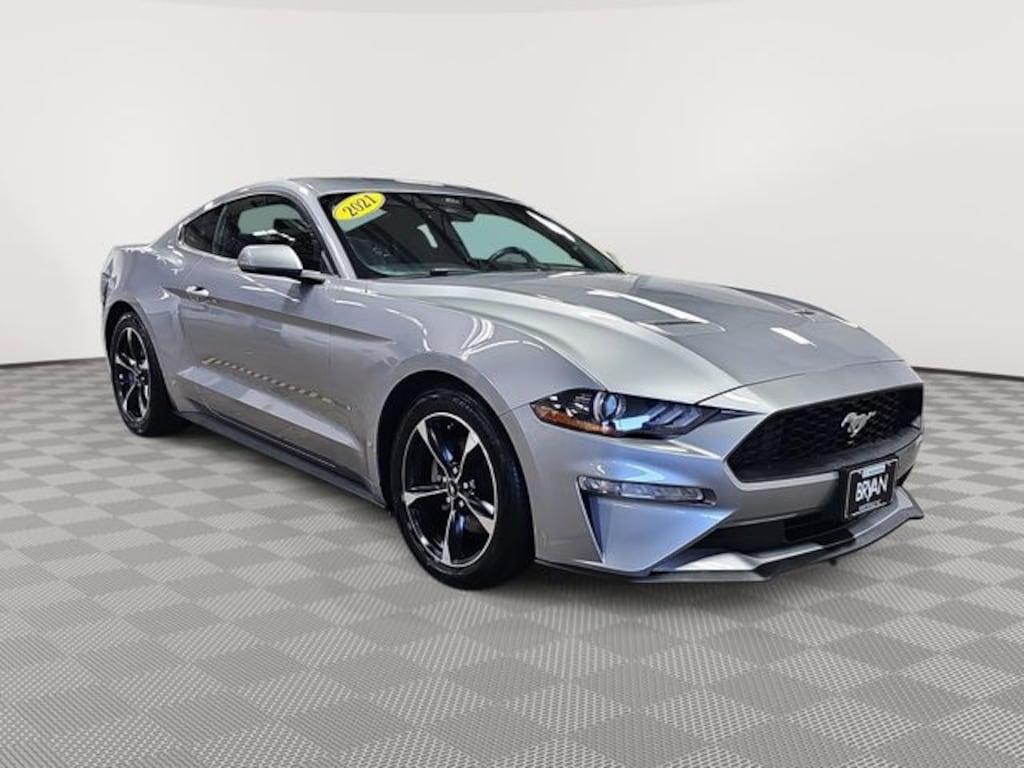 This 2021 Ford Mustang EcoBoost in Iconic Silver Metallic features: 4-Wheel Disc Brakes, 6 Speakers, ABS brakes, Air Conditioning, Alloy wheels, AM/FM Stereo, AM/FM Stereo w/MP3 Player, Auto High-beam Headlights, Auto-dimming Rear-View mirror, Brake assist, Bumpers: body-color, Cloth Bucket Seats, Compass, Delay-off headlights, Driver door bin, Driver vanity mirror, Dual front impact airbags, Dual front side impact airbags, Dual-Zone Automatic Temperature Control, Electronic Stability Control, Emergency communication system: 911 Assist, Equipment Group 101A, Exterior Parking Camera Rear, Four wheel independent suspension, Front anti-roll bar, Front Bucket Seats, Front Center Armrest, Front reading lights, Fully automatic headlights, Illuminated entry, Knee airbag, Leather Shift Knob, Low tire pressure warning, Occupant sensing airbag, Outside temperature display, Overhead airbag, Overhead console, Panic alarm, Passenger door bin, Passenger vanity mirror, Power door mirrors, Power steering, Power windows, Radio data system, Rain sensing wipers, Rear anti-roll bar, Rear window defroster, Remote keyless entry, Reverse Sensing System, Security system, Selectable Drive Modes w/Toggle Switches, SiriusXM Radio, Speed control, Speed-sensing steering, Speed-Sensitive Wipers, Split folding rear seat, Steering wheel mounted audio controls, SYNC 3 Communications & Entertainment System, SYNC Communications & Entertainment System, Tachometer, Telescoping steering wheel, Tilt steering wheel, Traction control, Trip computer, Variably intermittent wipers, Voltmeter, Wheels: 17" x 7.5" Sparkle Silver-Painted Aluminum, Wheels: 18" x 8" Machined-Face Aluminum, Wheels: 18" x 8" Machined-Face Aluminum (641), LOCAL ONE OWNER.