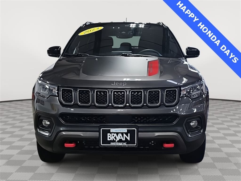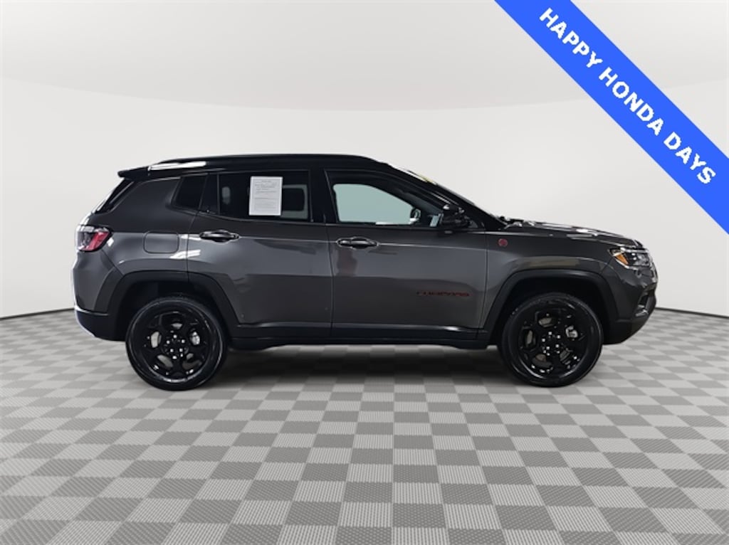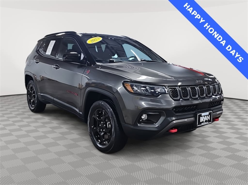 This 2023 Jeep Compass Trailhawk in Granite Crystal Metallic Clearcoat features: 4WD, Non Smoker, 4WD, 10.1" Touchscreen Display, 4-Wheel Disc Brakes, 4.398 Final Drive Ratio, 6 Speakers, ABS brakes, Air Conditioning, Alloy wheels, AM/FM radio: SiriusXM, Auto High-beam Headlights, Auto-dimming Rear-View mirror, Automatic temperature control, Brake assist, Bumpers: body-color, Compass, Delay-off headlights, Disassociated Touchscreen Display, Driver door bin, Driver vanity mirror, Dual front impact airbags, Dual front side impact airbags, Electronic Stability Control, Four wheel independent suspension, Front anti-roll bar, Front Bucket Seats, Front Center Armrest w/Storage, Front dual zone A/C, Front fog lights, Front License Plate Bracket, Front reading lights, Fully automatic headlights, Heated door mirrors, Illuminated entry, Knee airbag, Leather Shift Knob, Low tire pressure warning, Occupant sensing airbag, Outside temperature display, Overhead airbag, Overhead console, Panic alarm, ParkView Rear Back-Up Camera, Passenger door bin, Passenger vanity mirror, Power door mirrors, Power steering, Power windows, Premium Cloth/Leather Trim Bucket Seats, Quick Order Package 29E, Radio: Uconnect 5 w/10.1" Display, Rain sensing wipers, Rear anti-roll bar, Rear seat center armrest, Rear window defroster, Rear window wiper, Remote keyless entry, Security system, SiriusXM Radio Service, Speed control, Split folding rear seat, Spoiler, Steering wheel mounted audio controls, Tachometer, Telescoping steering wheel, Tilt steering wheel, Traction control, Trip computer, Turn signal indicator mirrors, Variably intermittent wipers, Wheels: 17" x 6.5" Painted Black Aluminum, LOCAL ONE OWNER.