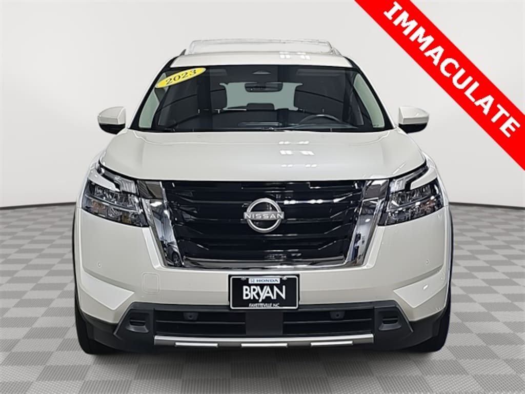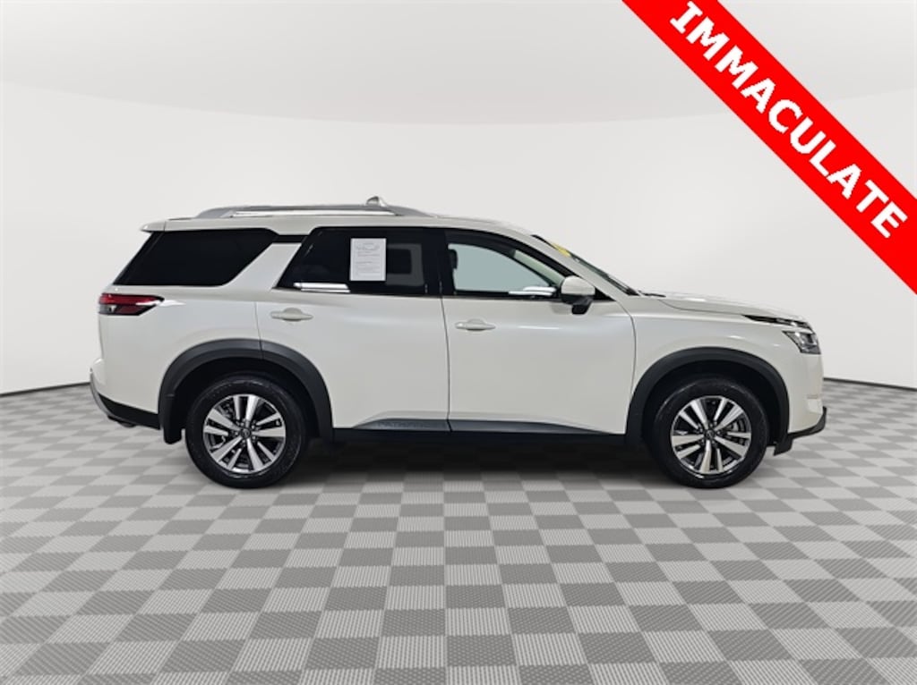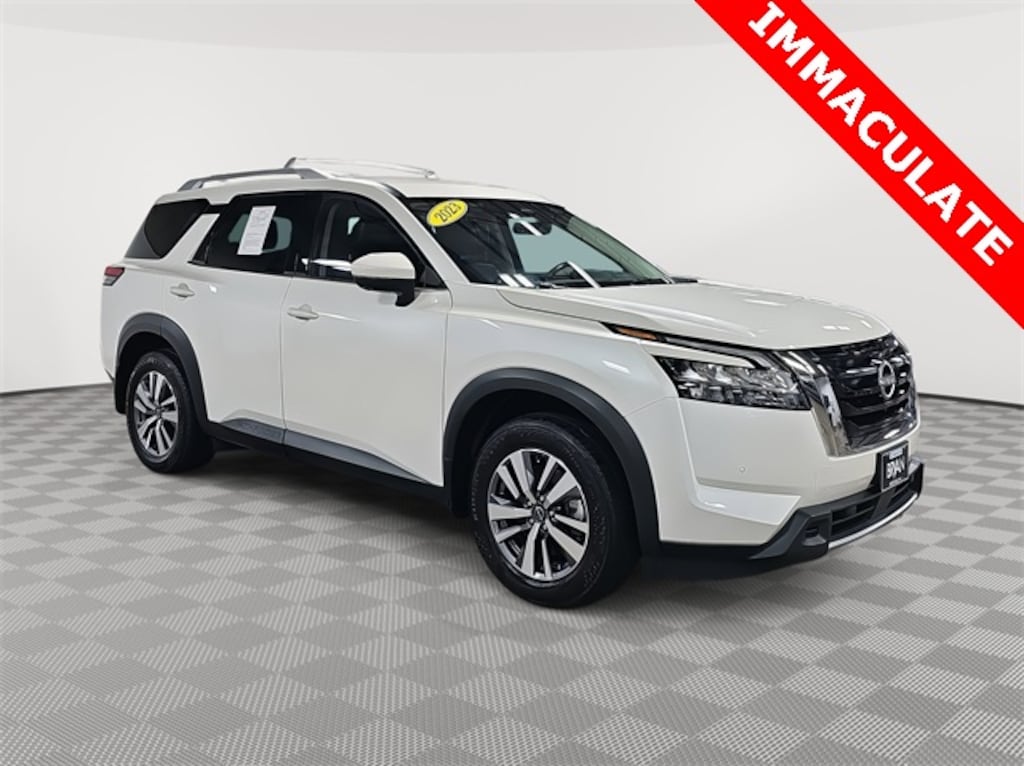 This 2023 Nissan Pathfinder SL in Pearl White Tricoat features: 18" Machined Alloy Wheels, 3rd row seats: bench, 4-Wheel Disc Brakes, 6 Speakers, ABS brakes, Air Conditioning, Alloy wheels, AM/FM radio: SiriusXM, Auto High-beam Headlights, Auto-dimming Rear-View mirror, Automatic temperature control, Axle Ratio: 4.334, Bench Seat Carpeted Floor Mats (Set of 4), Black Splash Guards (Set of 4), Bose Premium Audio System, Brake assist, Bumpers: body-color, Cross Bars, Delay-off headlights, Driver door bin, Driver vanity mirror, Dual front impact airbags, Dual front side impact airbags, Electronic Stability Control, Emergency communication system: NissanConnect Services, Exterior Parking Camera Rear, Four wheel independent suspension, Front anti-roll bar, Front Bucket Seats, Front Center Armrest, Front dual zone A/C, Front reading lights, Fully automatic headlights, Garage door transmitter: HomeLink, Heated door mirrors, Heated Front Bucket Seats, Heated front seats, Heated steering wheel, Illuminated entry, Knee airbag, Leather Seating Surfaces, Leather steering wheel, Low tire pressure warning, Navigation system: NissanConnect Navigation, NissanConnect w/Navigation & Services, Occupant sensing airbag, Outside temperature display, Overhead airbag, Overhead console, Panic alarm, Passenger door bin, Passenger vanity mirror, Power door mirrors, Power driver seat, Power Liftgate, Power passenger seat, Power steering, Power windows, Radio data system, Radio: AM/FM Audio System, Rear air conditioning, Rear anti-roll bar, Rear reading lights, Rear seat center armrest, Rear side impact airbag, Rear window defroster, Rear window wiper, Reclining 3rd row seat, Remote keyless entry, Security system, Speed control, Speed-sensing steering, Split folding rear seat, Spoiler, Steering wheel mounted audio controls, Tachometer, Telescoping steering wheel, Tilt steering wheel, Traction control, Trip computer, Turn signal indicator mirrors, Variably intermittent wipers, LOCAL AREA OWNER.