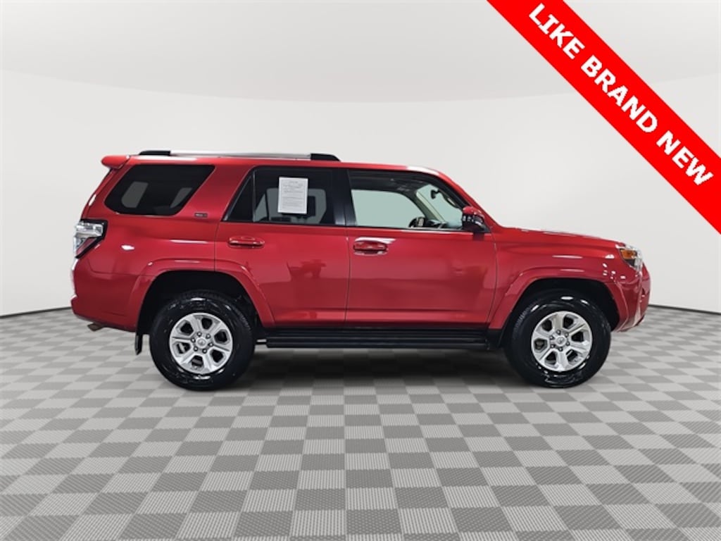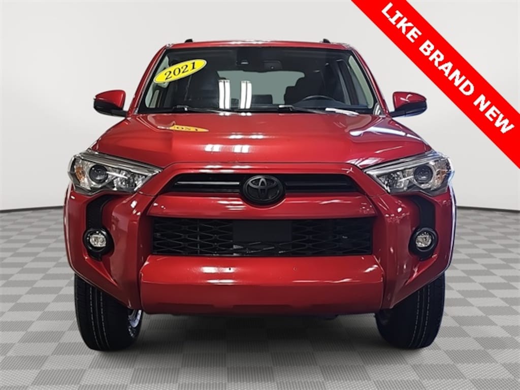 This 2021 Toyota 4Runner SR5 in Barcelona Red Metallic features: 4WD, Graphite Cloth, 4WD, Graphite Cloth, 17" x 7.0" 6-Spoke Alloy Wheels, 3.727 Axle Ratio, 4-Wheel Disc Brakes, 8 Speakers, ABS brakes, Air Conditioning, Alloy wheels, AM/FM radio: SiriusXM, Anti-whiplash front head restraints, Apple CarPlay/Android Auto, Auto High-beam Headlights, Brake assist, Bumpers: body-color, Driver door bin, Driver vanity mirror, Dual front impact airbags, Dual front side impact airbags, Electronic Stability Control, Emergency communication system: Safety Connect with 1-year trial, Exterior Parking Camera Rear, Front anti-roll bar, Front Bucket Seats, Front Center Armrest, Front fog lights, Front reading lights, Front wheel independent suspension, Heated door mirrors, Illuminated entry, Knee airbag, Leather Shift Knob, Leather steering wheel, Low Fabric Seat Trim, Low tire pressure warning, Occupant sensing airbag, Outside temperature display, Overhead airbag, Overhead console, Panic alarm, Passenger door bin, Passenger vanity mirror, Power door mirrors, Power driver seat, Power steering, Power windows, Radio: Audio, Rear anti-roll bar, Rear seat center armrest, Rear window defroster, Rear window wiper, Remote keyless entry, Roof rack: rails only, Running Boards, Security system, Smart Key, Speed control, Speed-sensing steering, Split folding rear seat, Spoiler, Steering wheel mounted audio controls, Tachometer, Telescoping steering wheel, Tilt steering wheel, Traction control, Trip computer, Variably intermittent wipers, LOCAL AREA OWNER.
